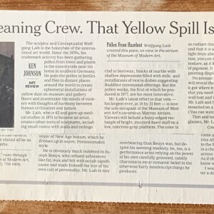 (Wolfgang Laib). Ken Johnson. Don’t Call the Cleaning Crew. That Yellow Spill is Art. The New York Times. February 1, 2013, pages C 23, C 26. Clipping.