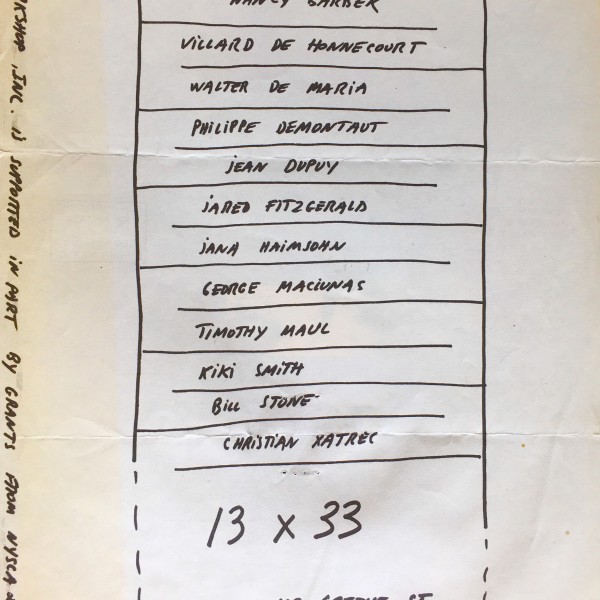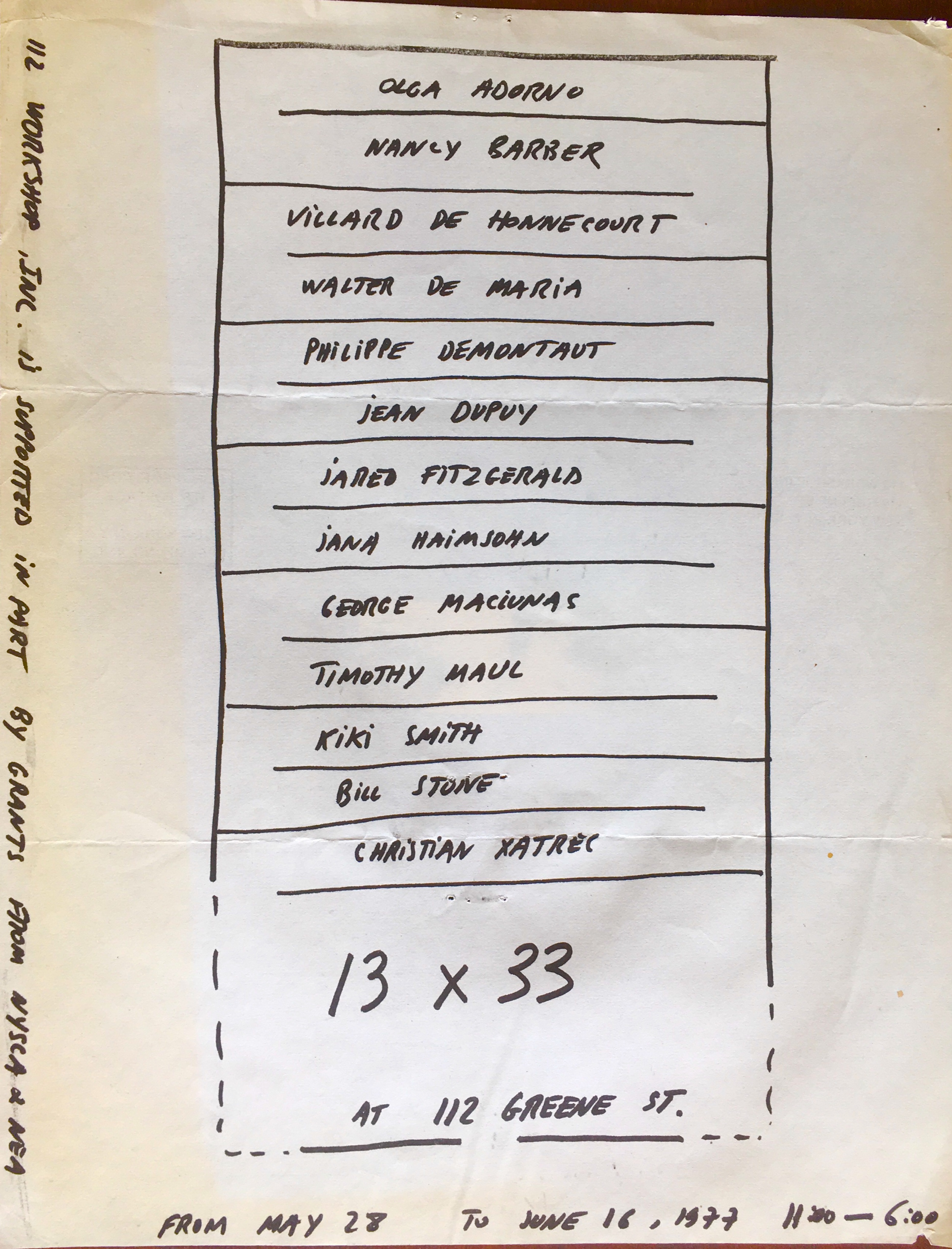 13 x 33 (i.e. Thirteen by thirty-three). 112 Greene Street, [New York], May 23-June 16, 1977