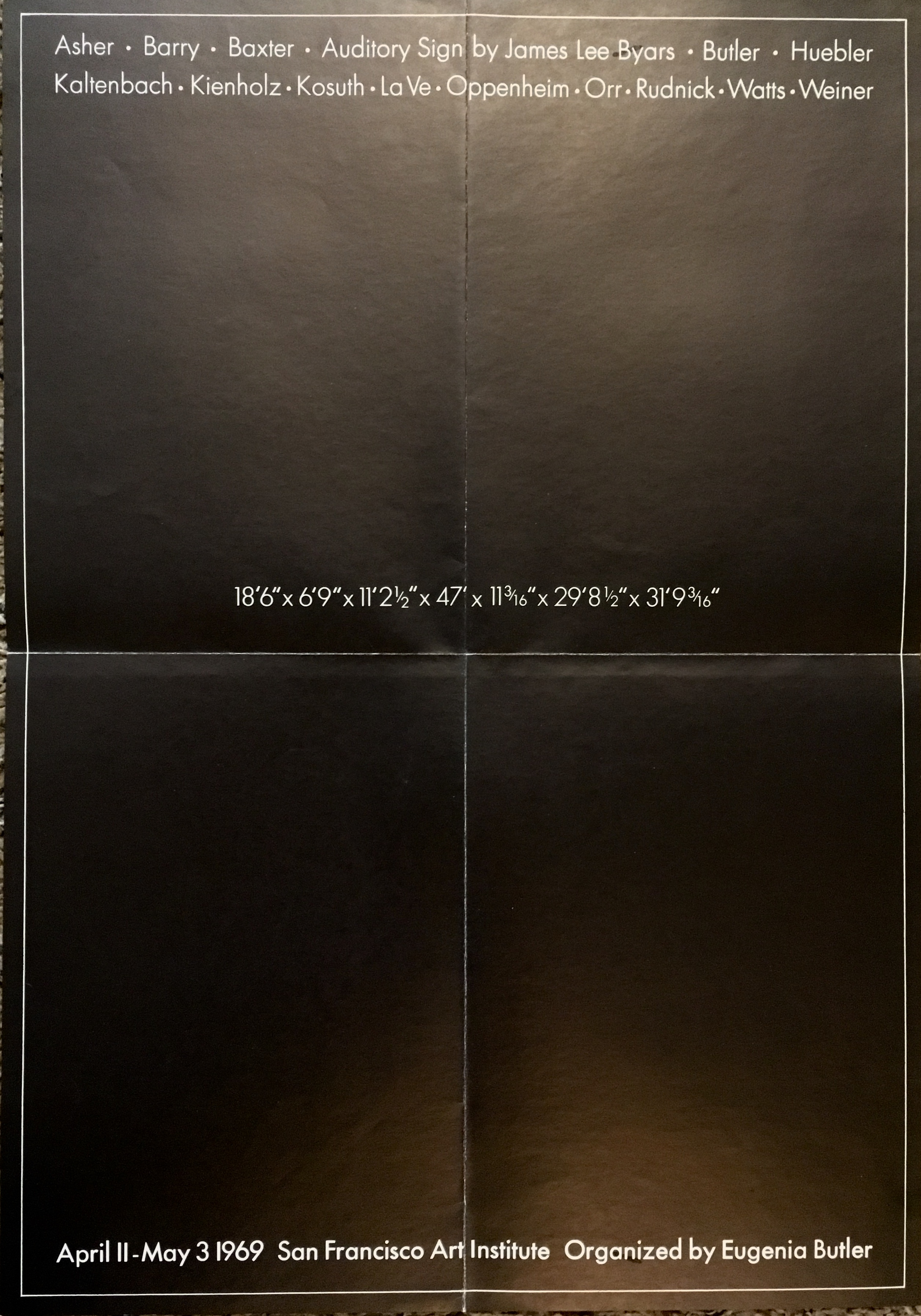 Organized by Eugenia Butler. Michael Asher, Robert Barry, Eugenia Butler, James Lee Byars, Iain Baxter, Douglas Huebler, Stephen Kaltenbach, Edward Kienholz, Joseph Kosuth, Barry LeVa (misprinted LaVe), Dennis Oppenhiem, Eric Orr, Tim Rudnick, Robert Watts, and Lawrence Weiner