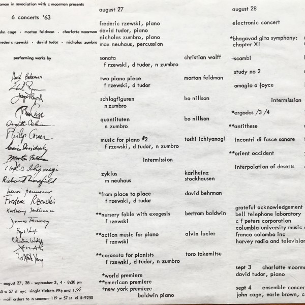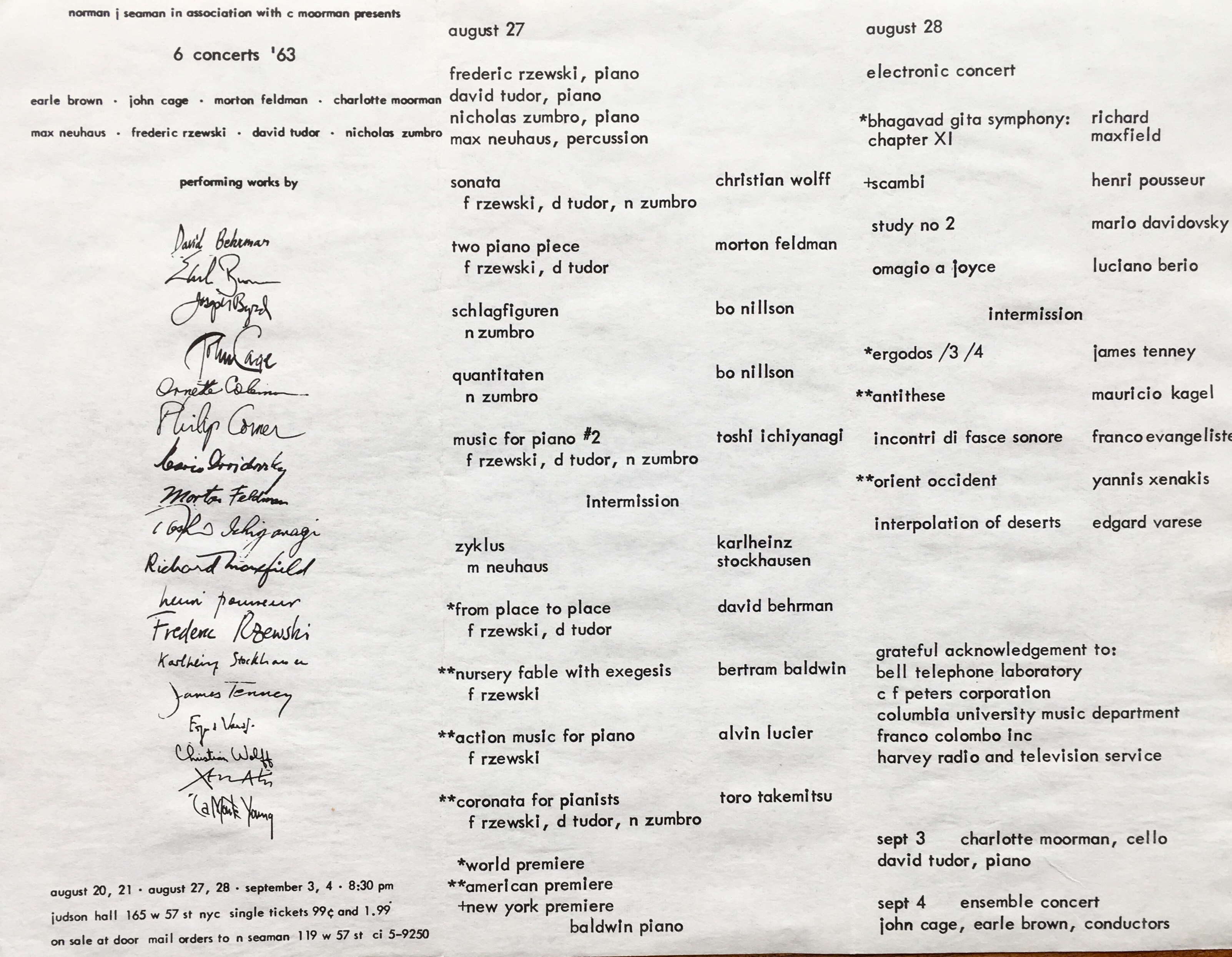 6 concerts ’63. Earle Brown, John Cage, Morton Feldman, Charlotte Moorman, Max Neuhaus, Frederic Rzewski, David Tudor, Nicholas Zumbro, performing works by David Behrman, Earle Brown, Joseph Byrd, John Cage, Ornette Coleman, Philip Corner, Mario Davidovsky, Morton Feldman, Toshi Ichiyanagi, Richard Mayfield, Henri Pousseur, Fredric Rzewski, Karlheinz Stockhausen, James Tenny, Edgar Varese, Christian Wolff, Yannis Xenakis, La Monte Young