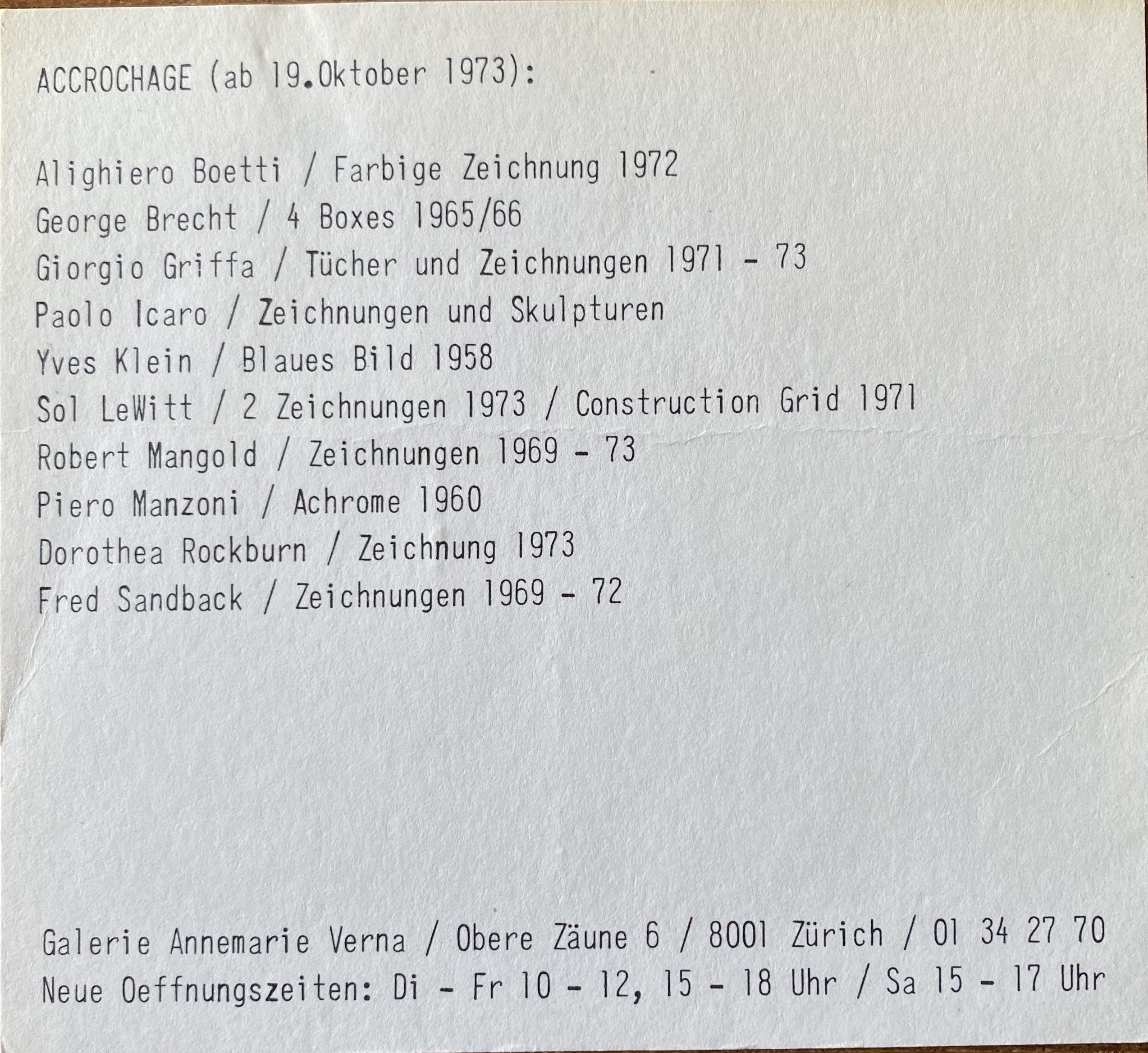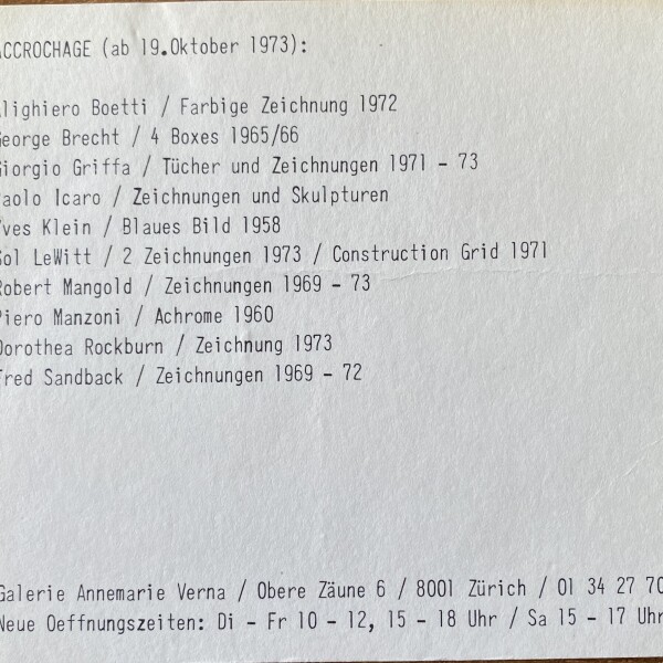 Accrochage. Galerie Annemarie Verna, Zürich, ab 19. Oktober 1973