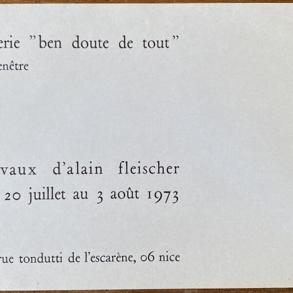 (Alain Fleischer). Travaux d’Alain Fleischer. Galerie “bendoute de tout” / la fenêtre, Nice, 20 juillet – 3 août 1973