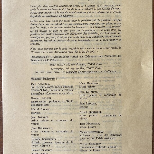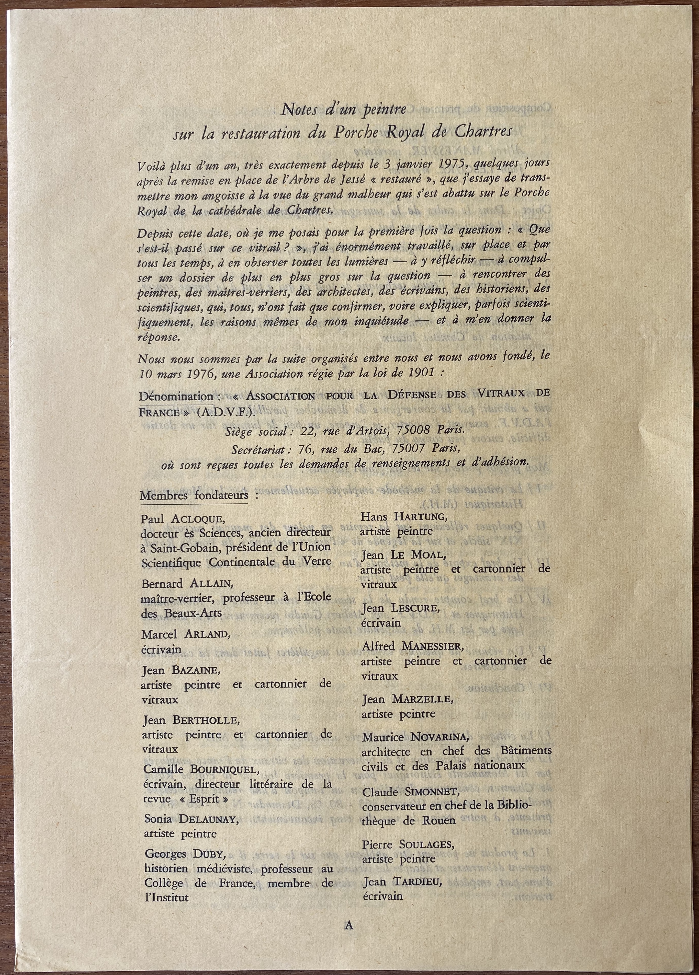 Alfred Manessier. Notes d’un peintre sur la restauration du Porche Royal de Chartres. Emancé, le 3 mai 1976. No place, no publisher, no date [Paris: Galerie de France, 1976]