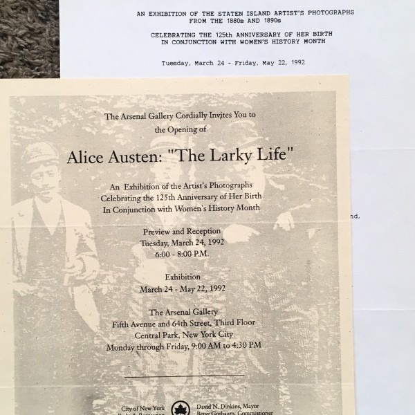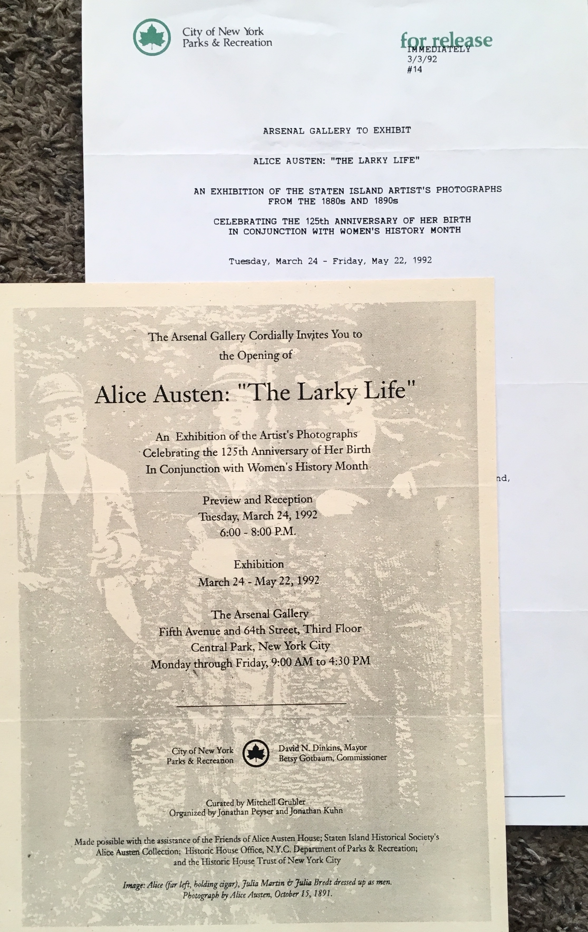 (Alice Austen). Alice Austen: “The Larky Life”. An Exhibition of the Artist’s Photographs Celebrating the 125th Anniversary of Her Birth In Conjunction with Women’s History Month. Arsenal Gallery, New York, March 24 – May 22, 1992.