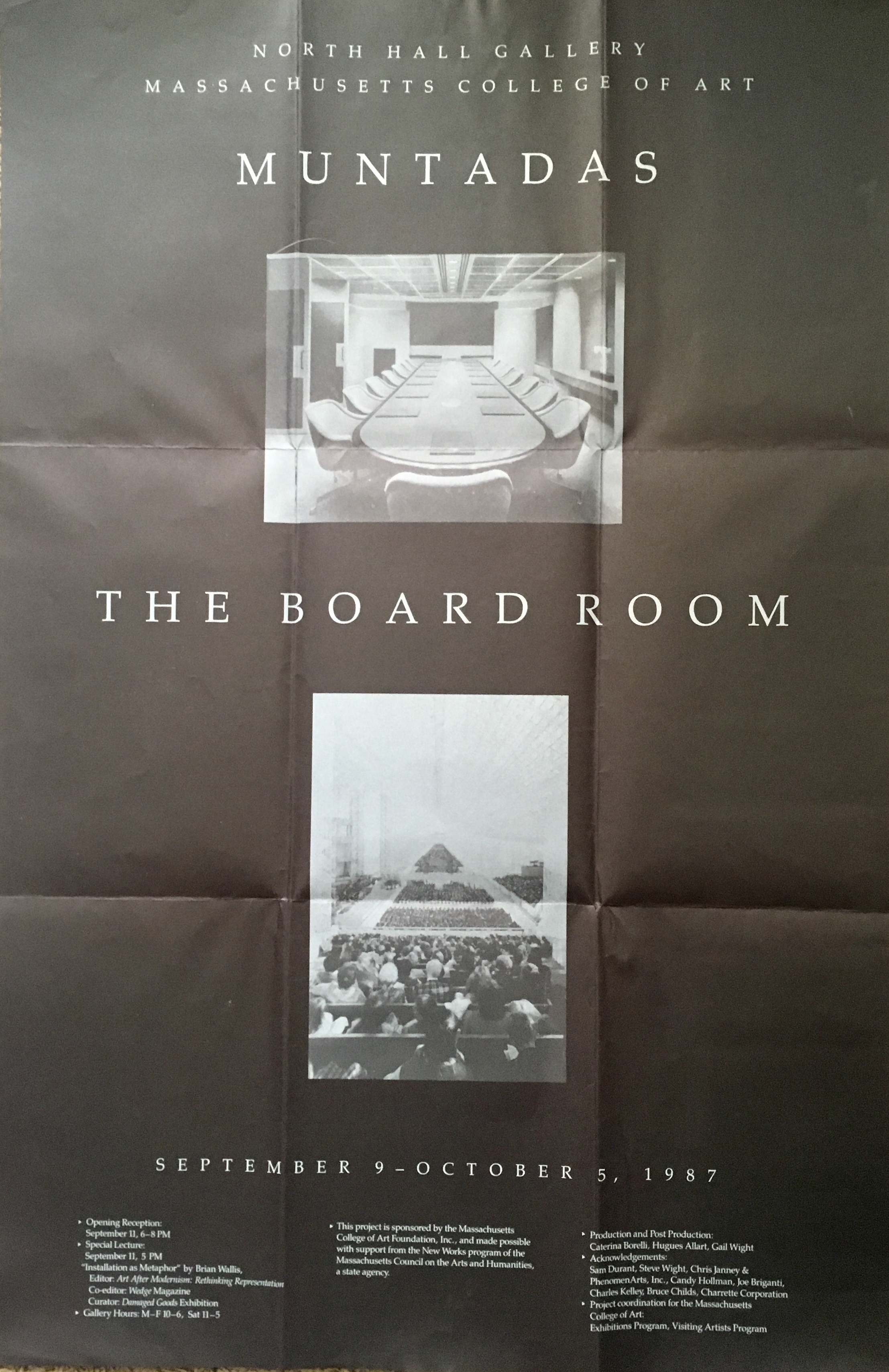 (Antoni Muntadas). Muntadas. The Board Room. Massachusettes College of Art, North Hal Gallery, [Boston]. September 9 – October 5, 1987