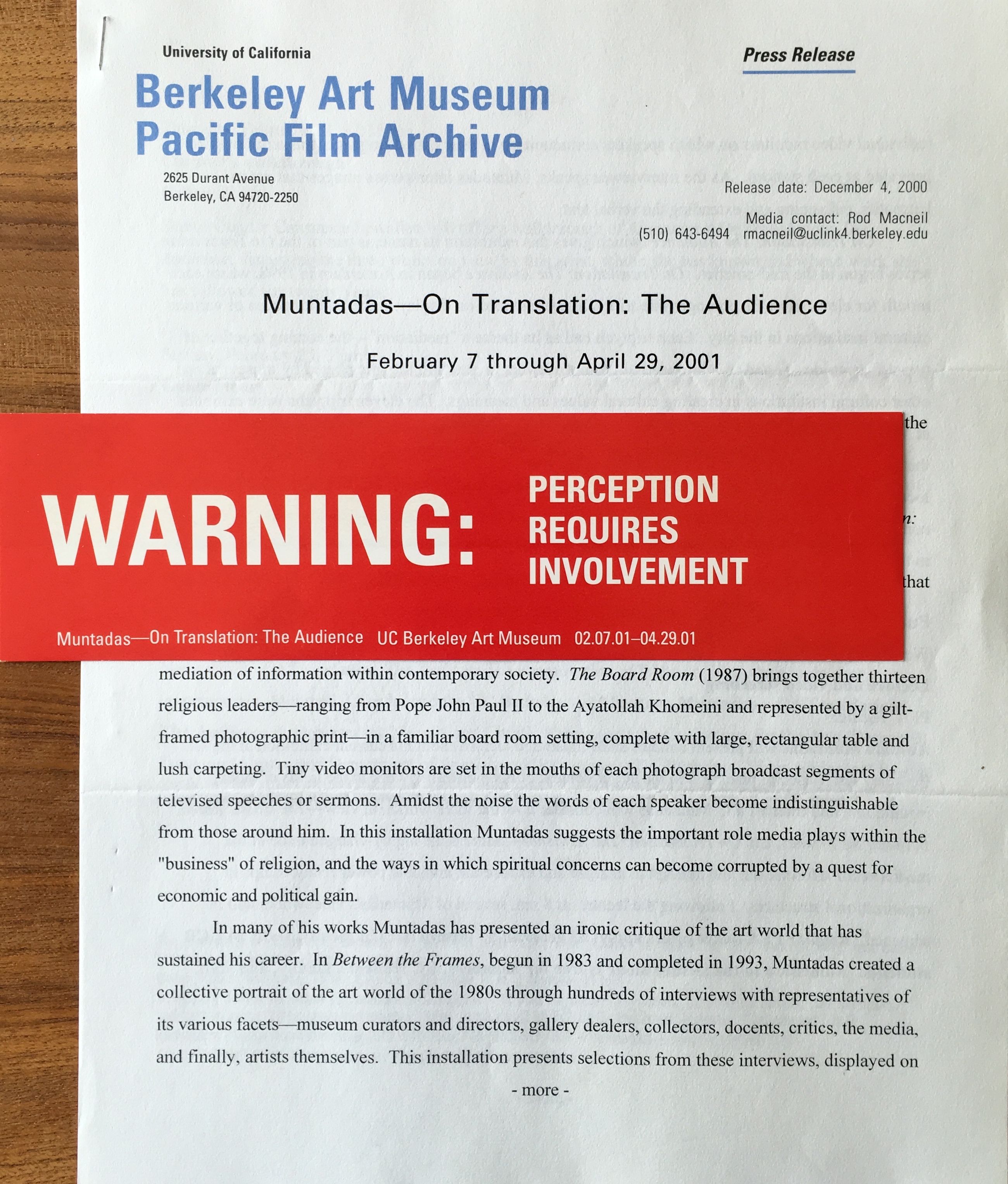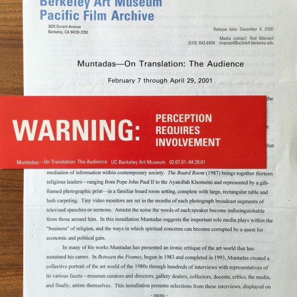 (Antoni Muntadas). Muntadas. Warning: Perception Requires Involvement / On Translation: The Audience. University of California, Berkeley Art Museum, February 7 – April 29, 2001