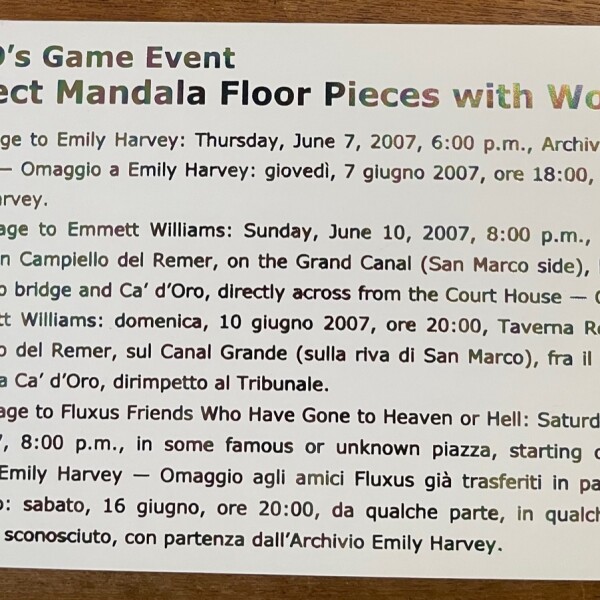 (Ay-O). Ay-O’s Venice Exhibition, Dedicated to Emily Harvey. Object Mandala Floor Pieces with Words. Archivio Emily Harvey, Venice, Italy, July 7 – 31, 2007 / Ay-O’s Event. Object Mandala Floor Pieces with Words. Archivio Emily Harvey, June 7, 2007
