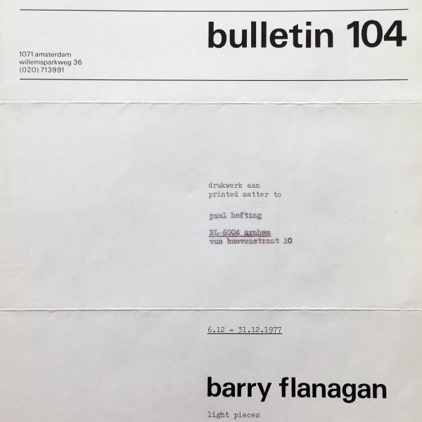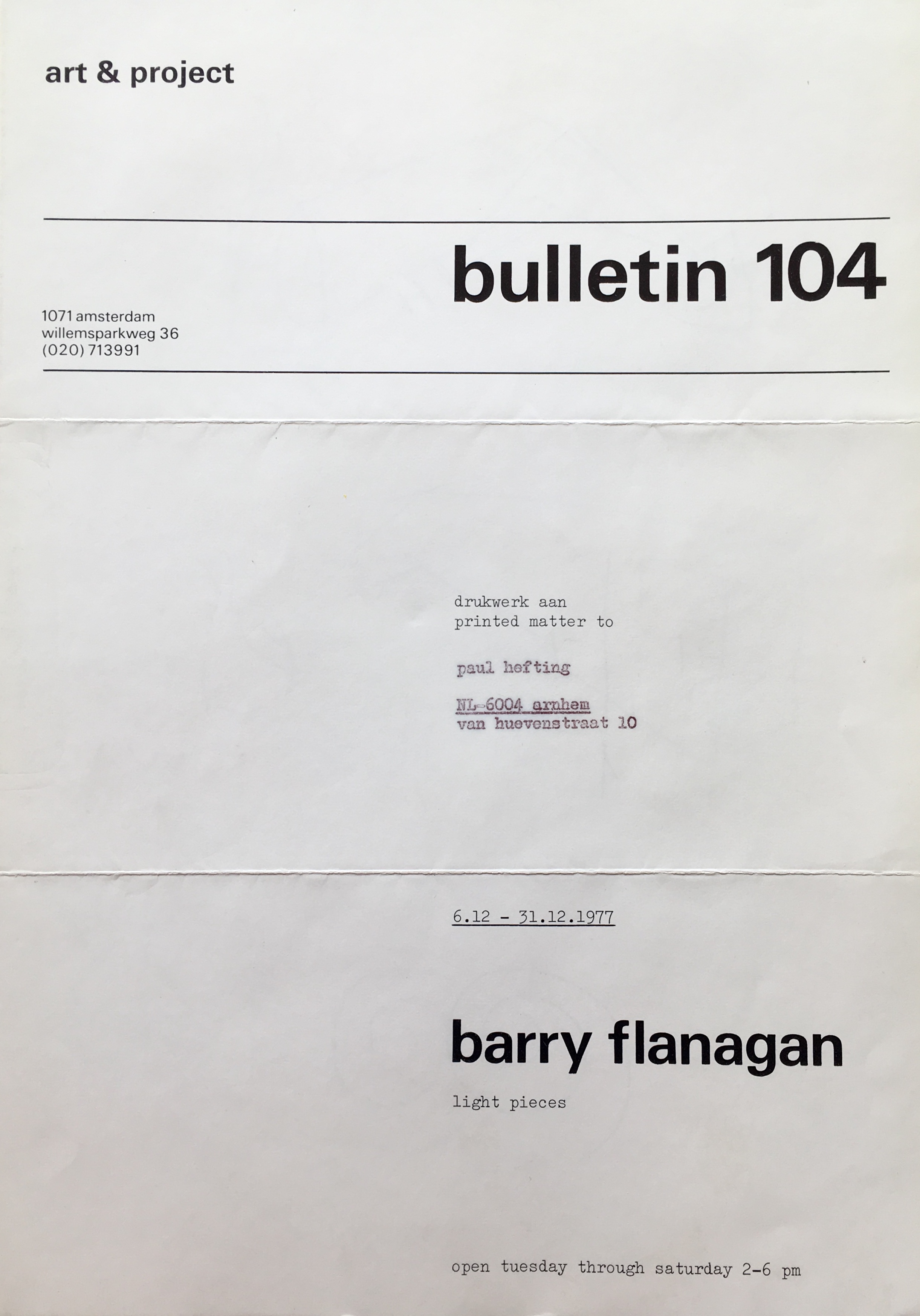 Barry Flanagan. Light places pieces. art & project, Amsterdam, 6 – 31.12.1977. (Bulletin 104) Folder 11 5/8 x 8 3/16″ / 29.5 x 20.8cm 2 horizontal folds, as mailed