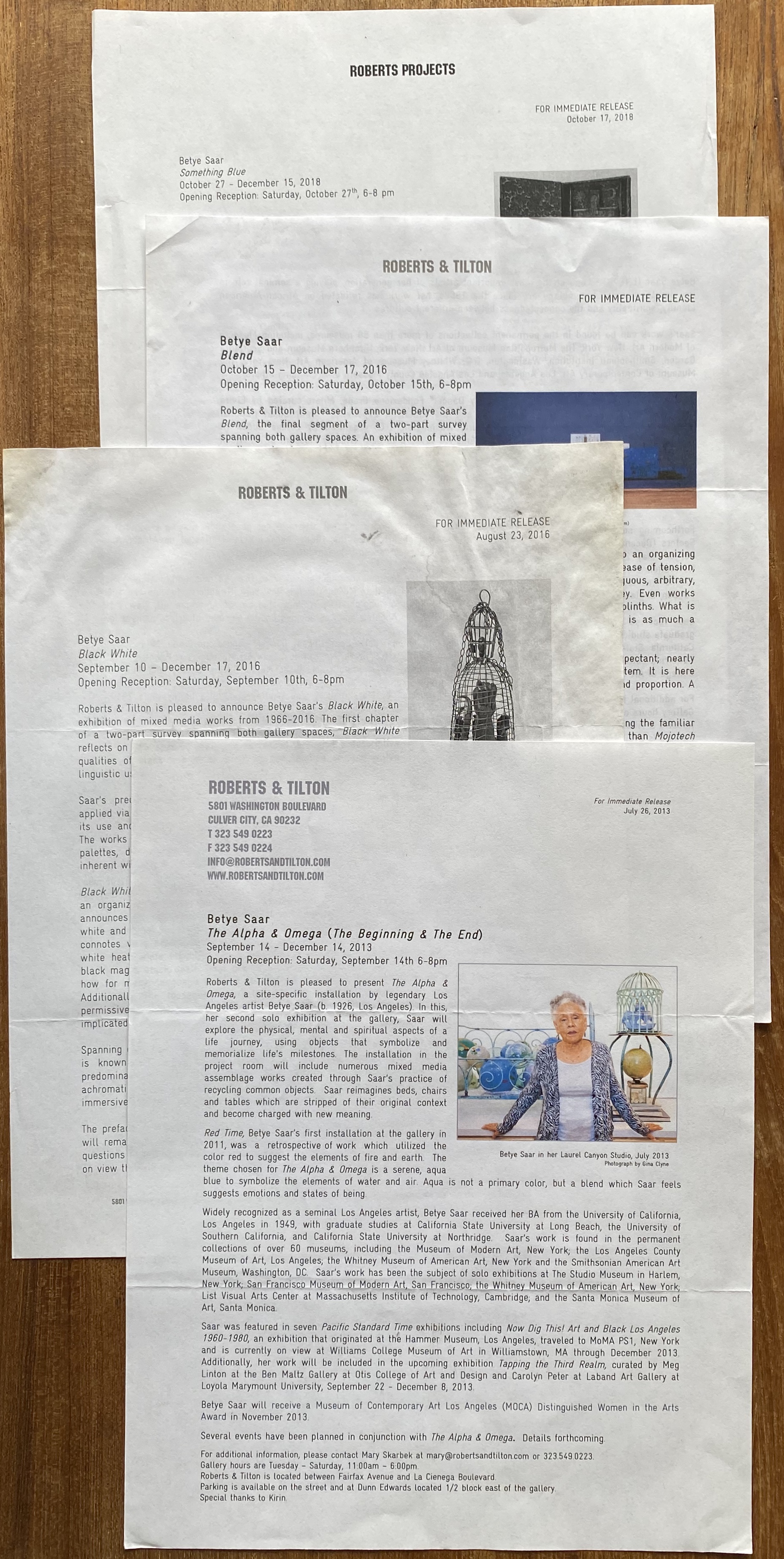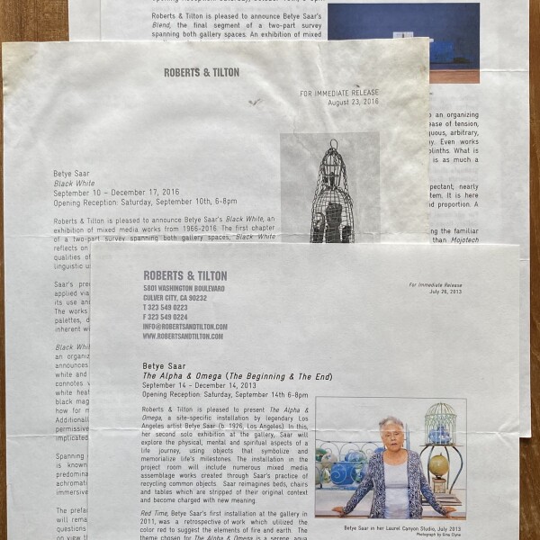 Betye Saar. 4 illustrated press releases, Roberts & Tilton, Culver City