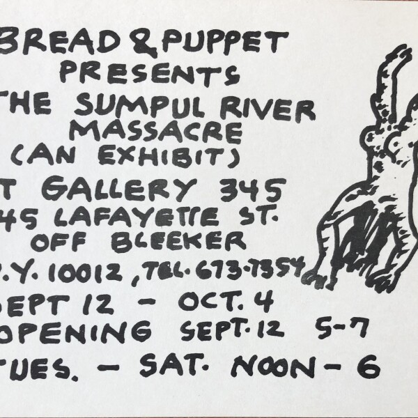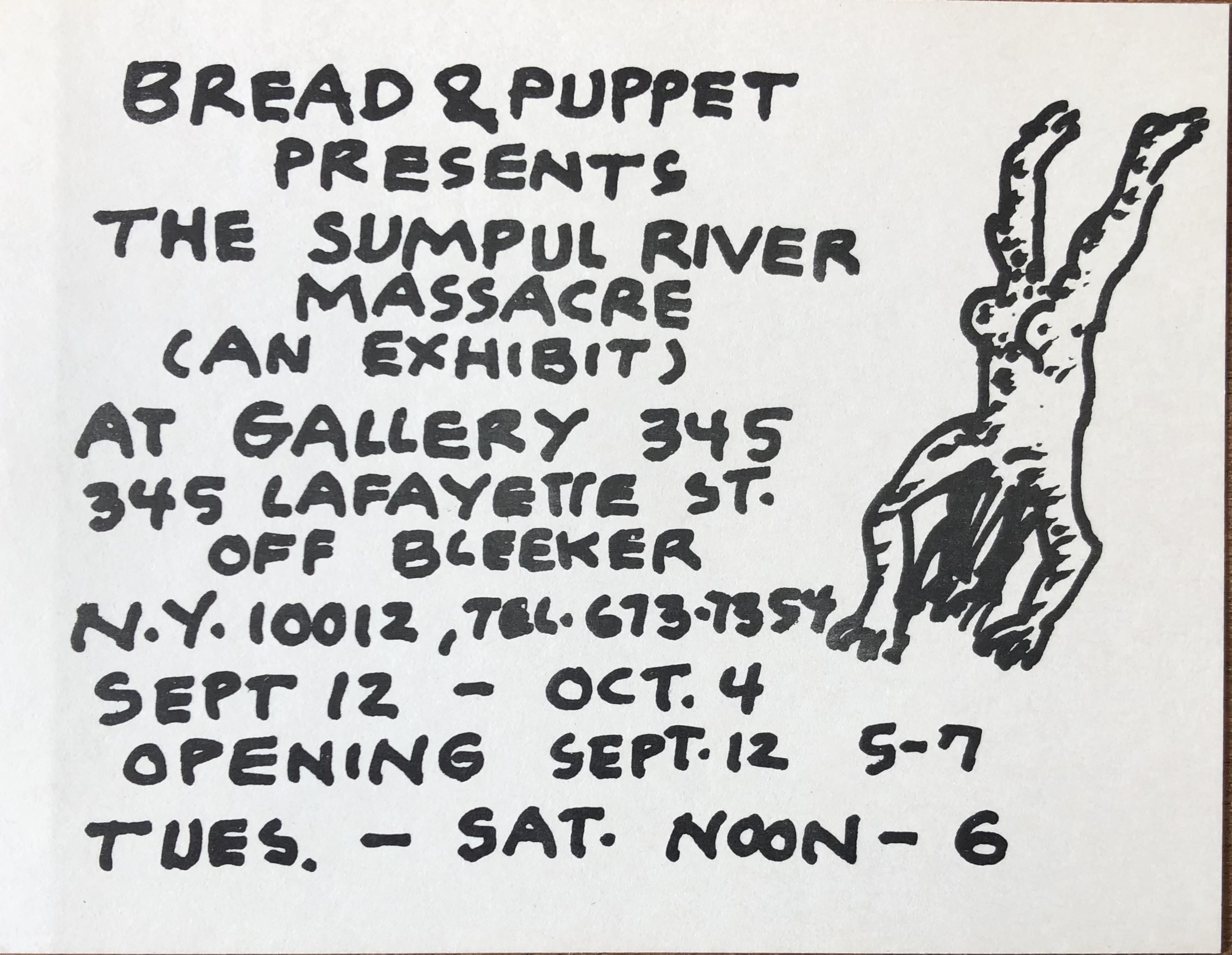 (Bread & Puppet). Bread & Puppet presents The Sumpul River Massacre (an exhibit) at Gallery 345, 345 Lafayette St. off Bleeker, N.Y. September 12 – October 4, [1981]