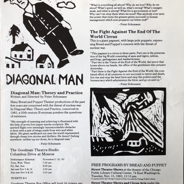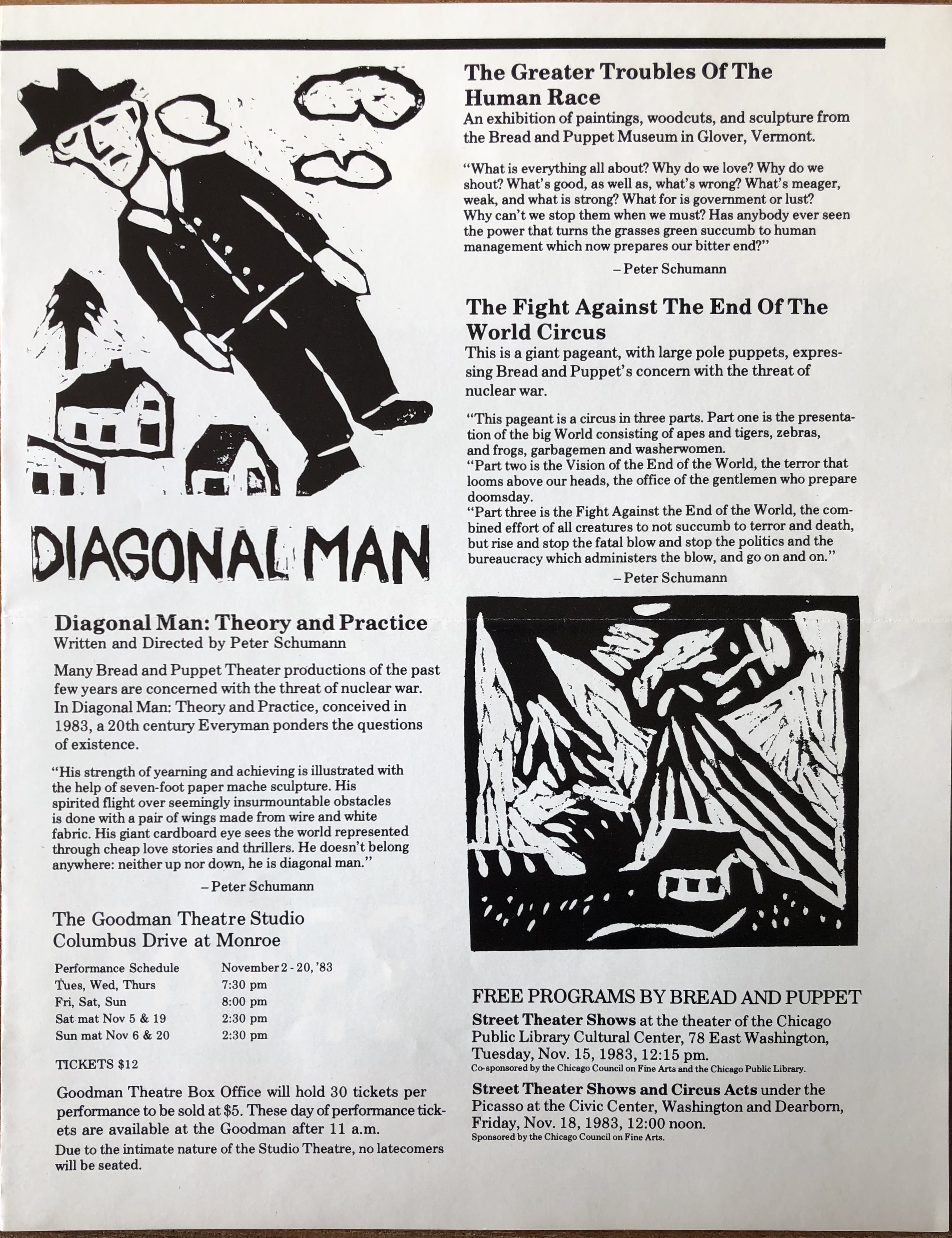 Bread & Puppet. Diagonal Man: Theory and Practice. The Goodman Theatre Studio, [Chicago], November 2 – 20, [1983] / The Greater Troubles of the Human Race. School of the Art Institute of Chicago, November 4 – 20, [1983] / The Fight Against the End of the World Circus. University of Chicago Mandela Hall, November 13, 14, [1983]