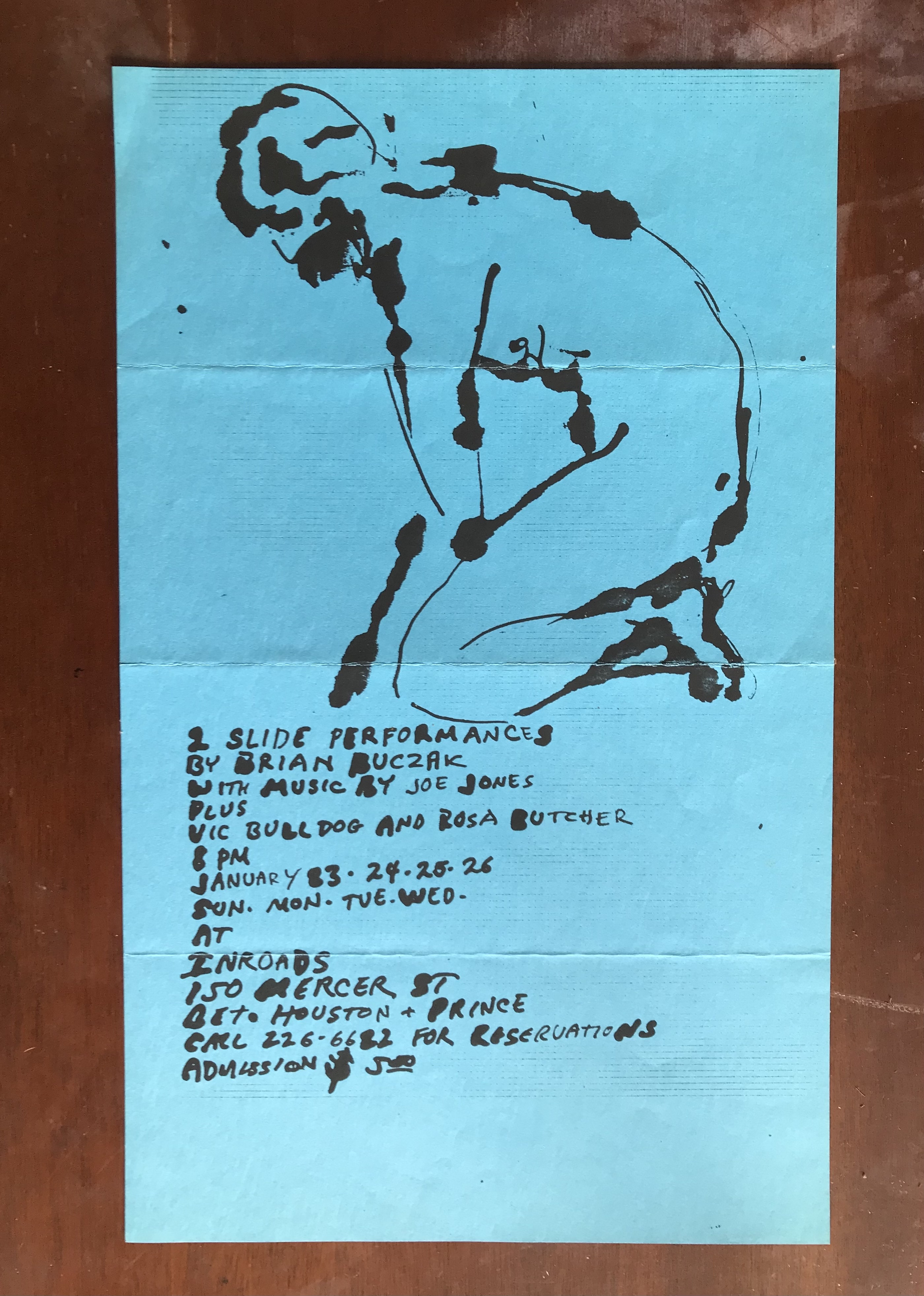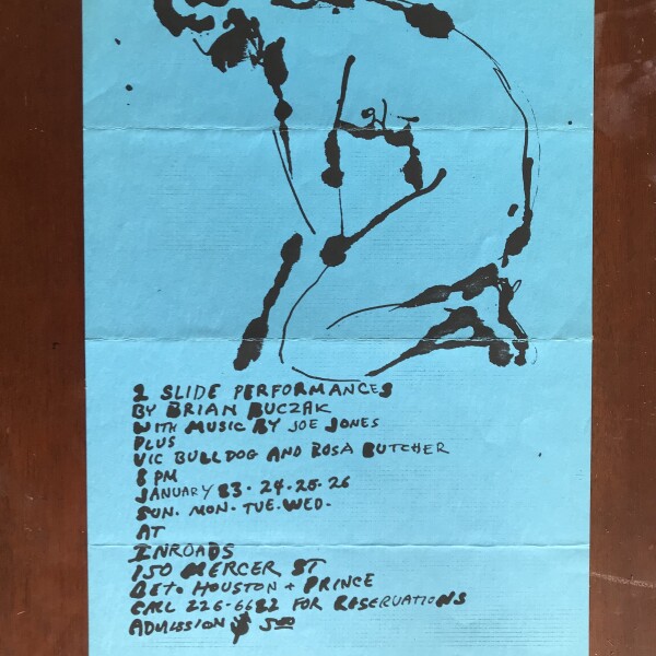 (Brian Buczak). 2 slide performances by Brian Buczak with music by Joe Jones. Inroads, [New York], January 24, 25, 26, 1983