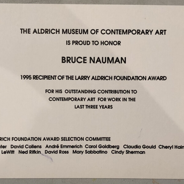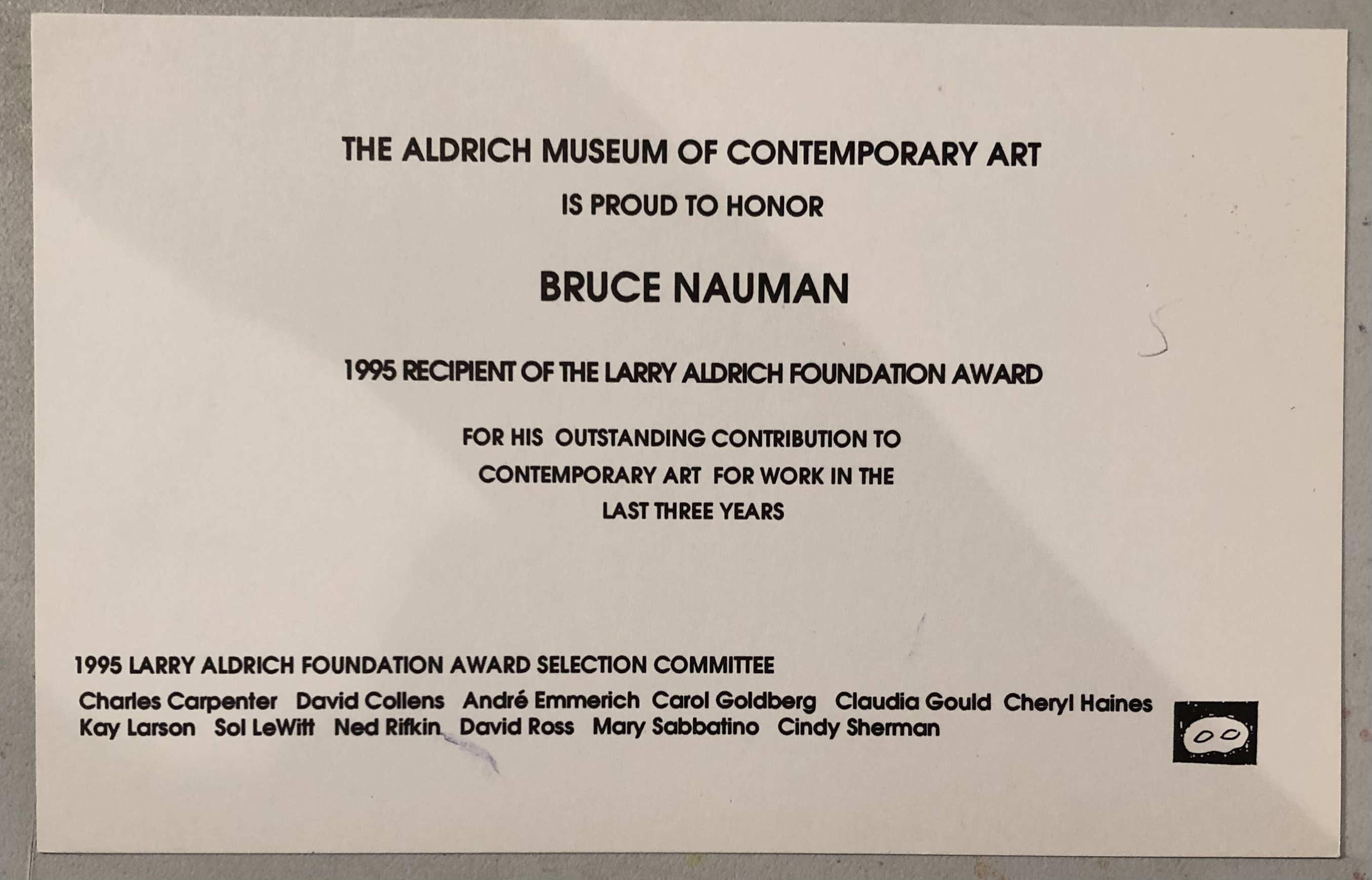 (Bruce Nauman). The Aldrich Museum of Contemporary Art is proud to honor Bruce Nauman, 1995 recipient of the Larry Aldrich Foundation Award… No date [October (?) 1995]