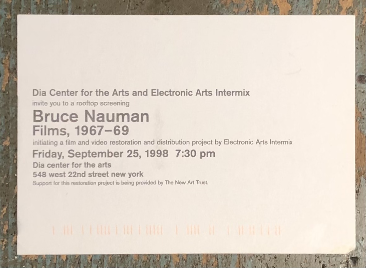 (Bruce Nauman). Bruce Nauman. Films, 1967-69. Dia Center for the Arts, New York, September 25, 1998