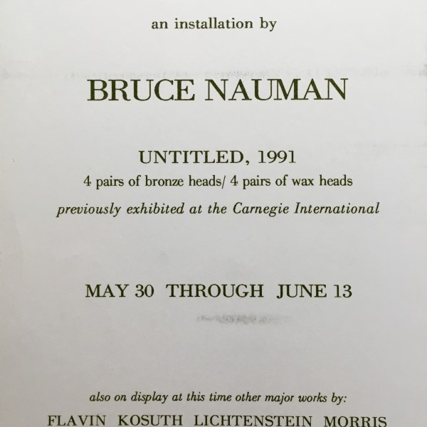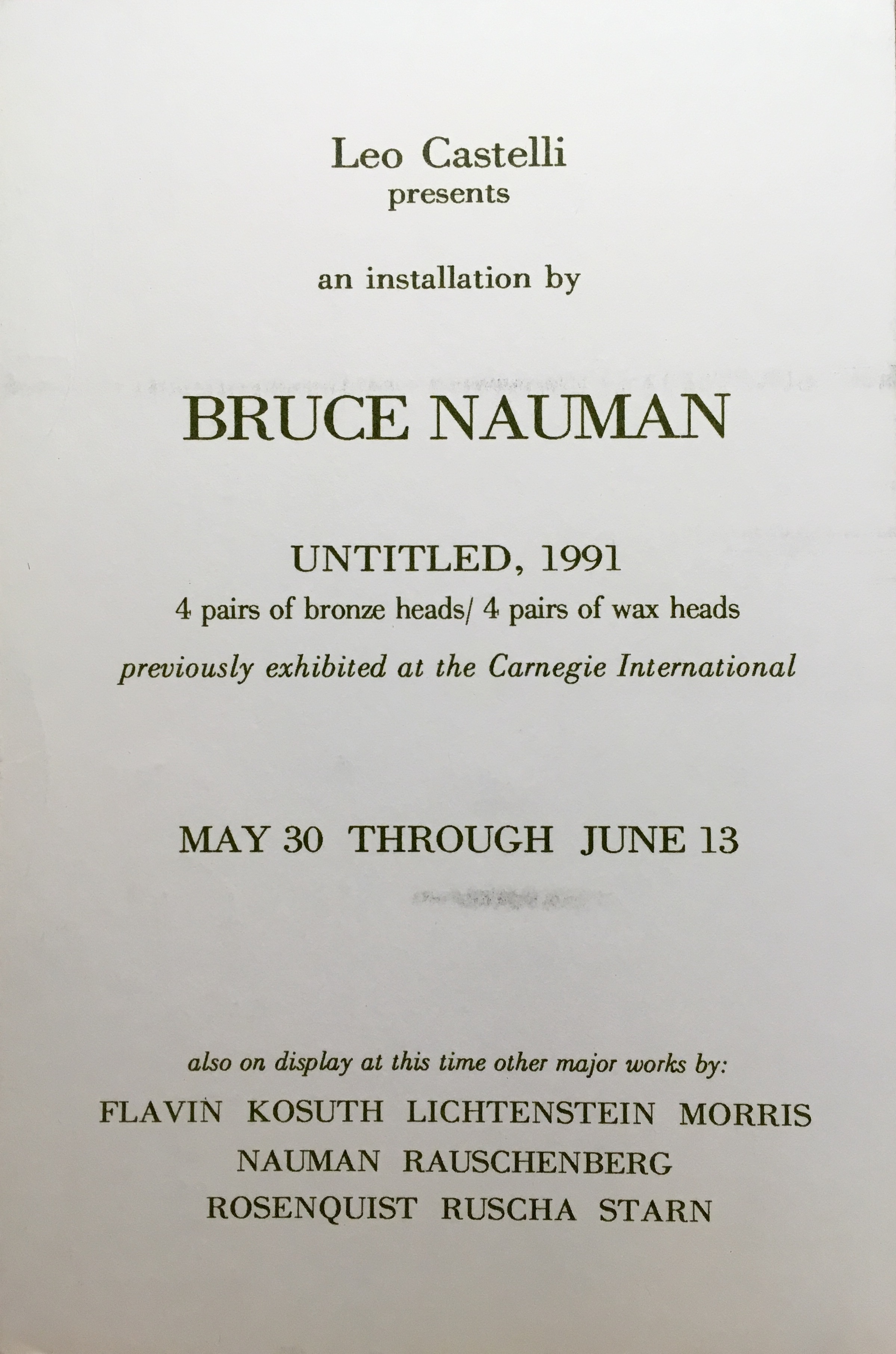 (Bruce Nauman). Leo Castelli presents an installation by Bruce Nauman. May 30 – June 13, 1992