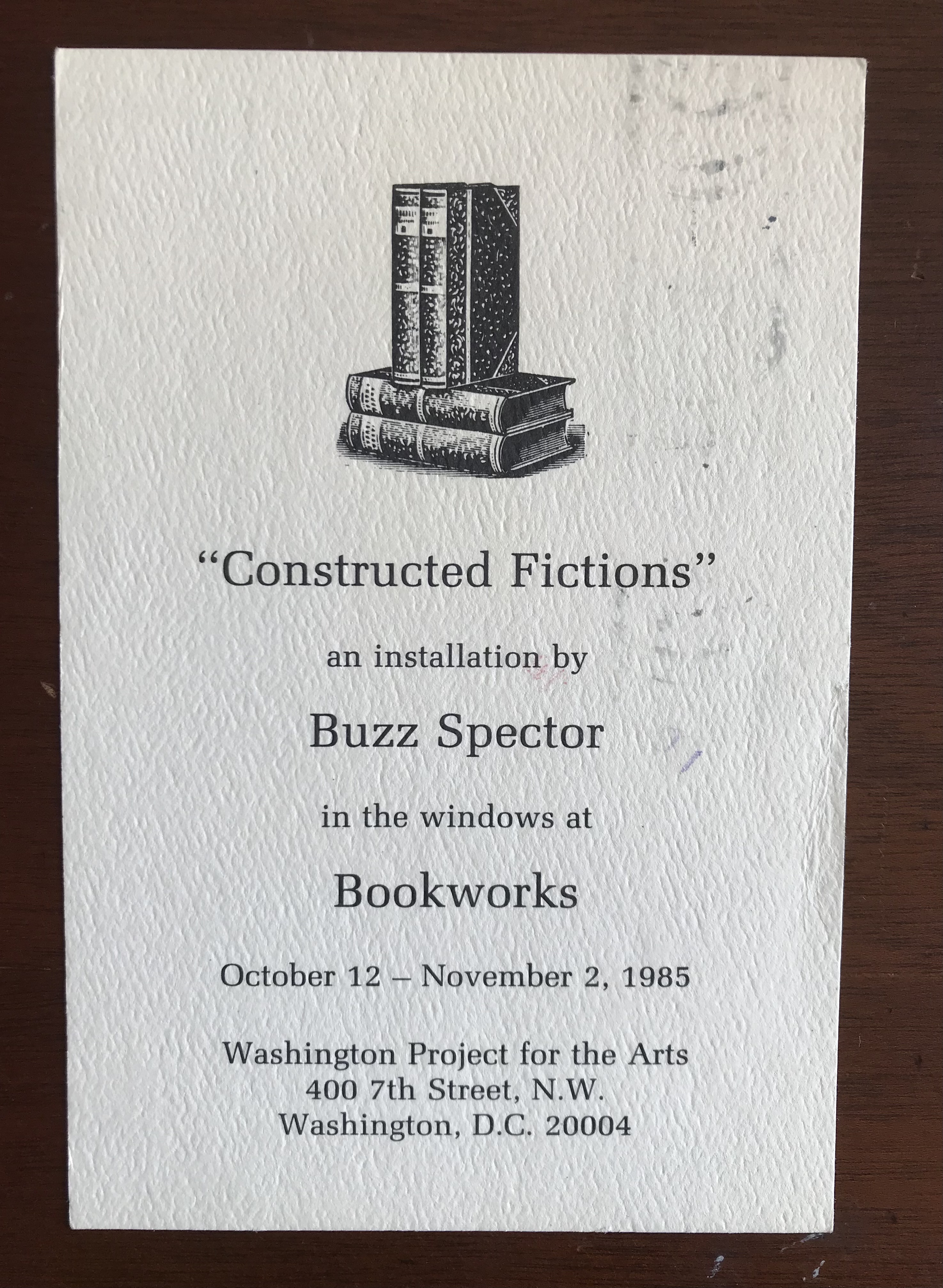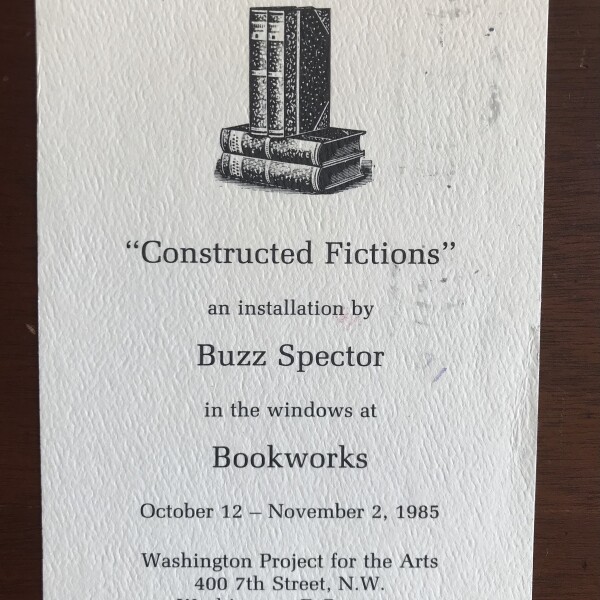 (Buzz Spector). “Constructed Fictions”. An installation by Buzz Spector. Bookworks, Washington Project for the Arts, Washington, D.C., October 12-November 2, 1985