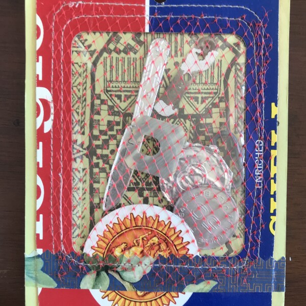 A postcard with a collage element and punch hole in upper edge stitched with a piece of cardboard with a plastic window and plastic mesh, holding loose elements: fake 50 cent coin, toy knife, plastic bread clip, and 2 unidentifiable objects