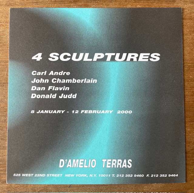 (Carl Andre, John Chamberlain, Dan Flavin, Donald Judd). 4 Sculptures. Carl Andre, John Chamberlain, Dan Flavin, Donald Judd. D’Amelio Terras, 8 January – 12 February 2000