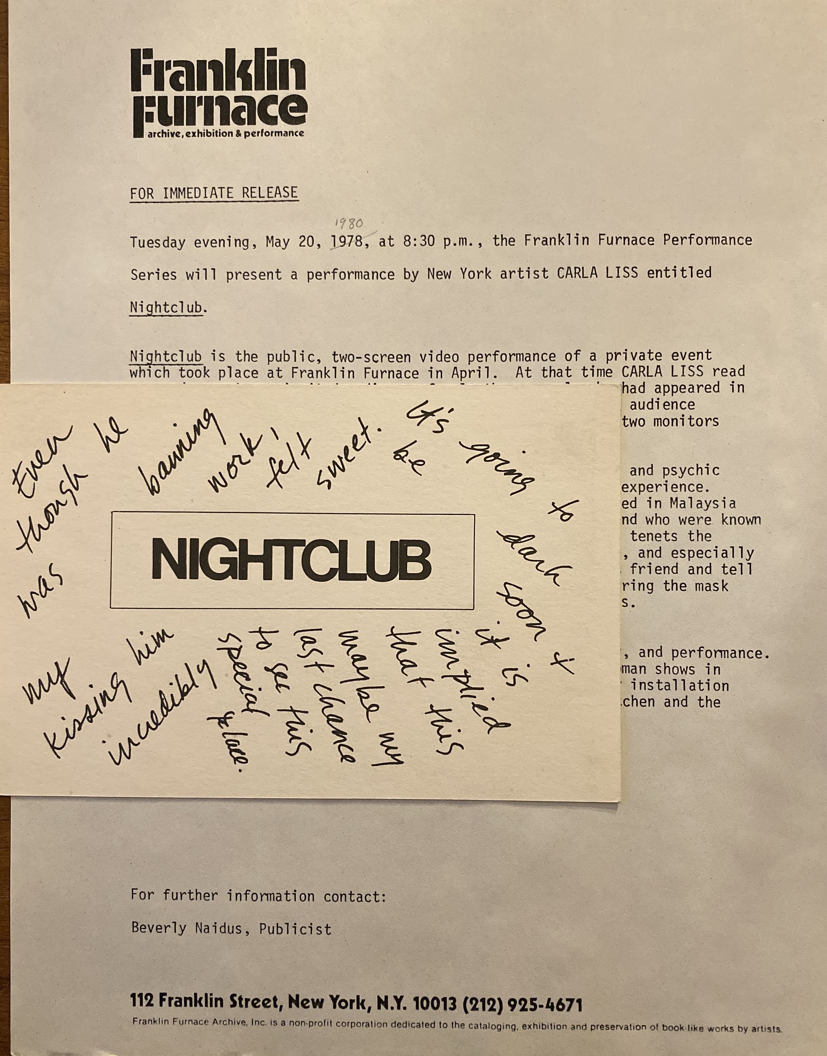 Carla Liss. Nightclub. Franklin Furnace, New York, May 20, 1980
