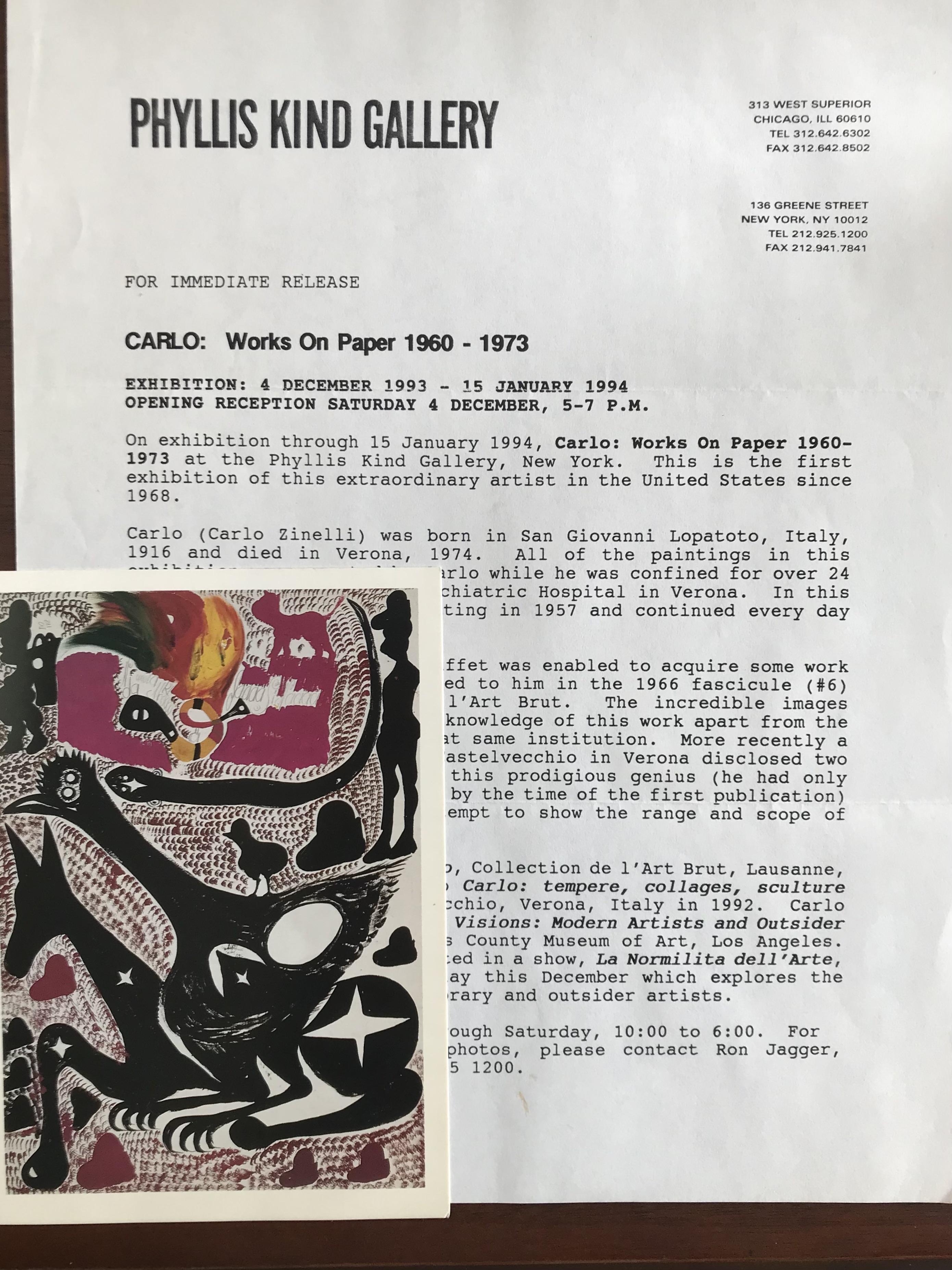 (Carlo, Carlo Zinelli known as). Carlo. Phyllis Kind Gallery, New York, December 4, [1993]- January 14, 1994