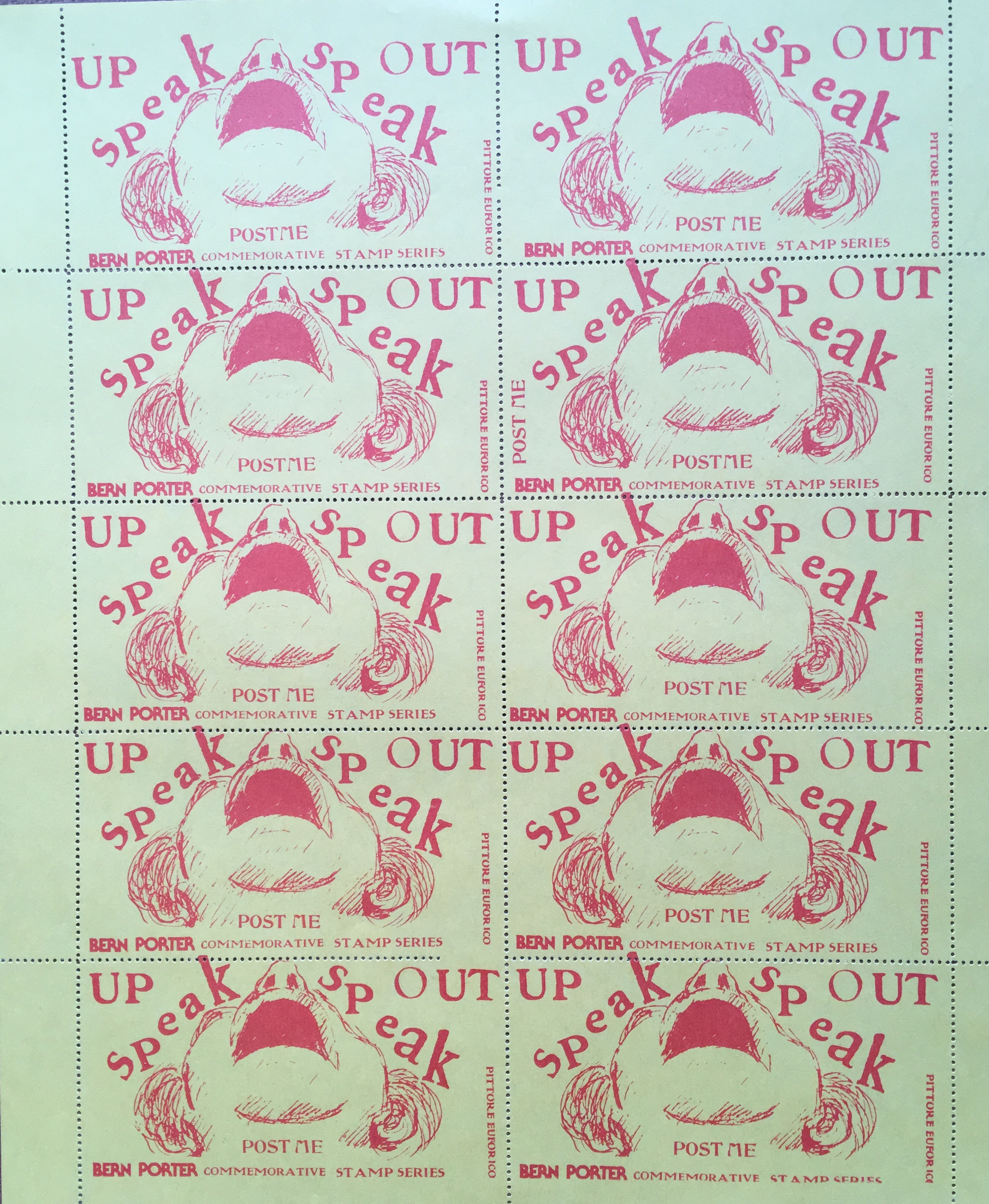 Carlo Pittore. (Charles Stanley also known as). Bern Porter commerical stamp series. 10 x 8 1/2″ / 25.2 x 21.2cm. Pittore Euforico: [1981]