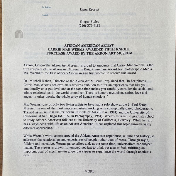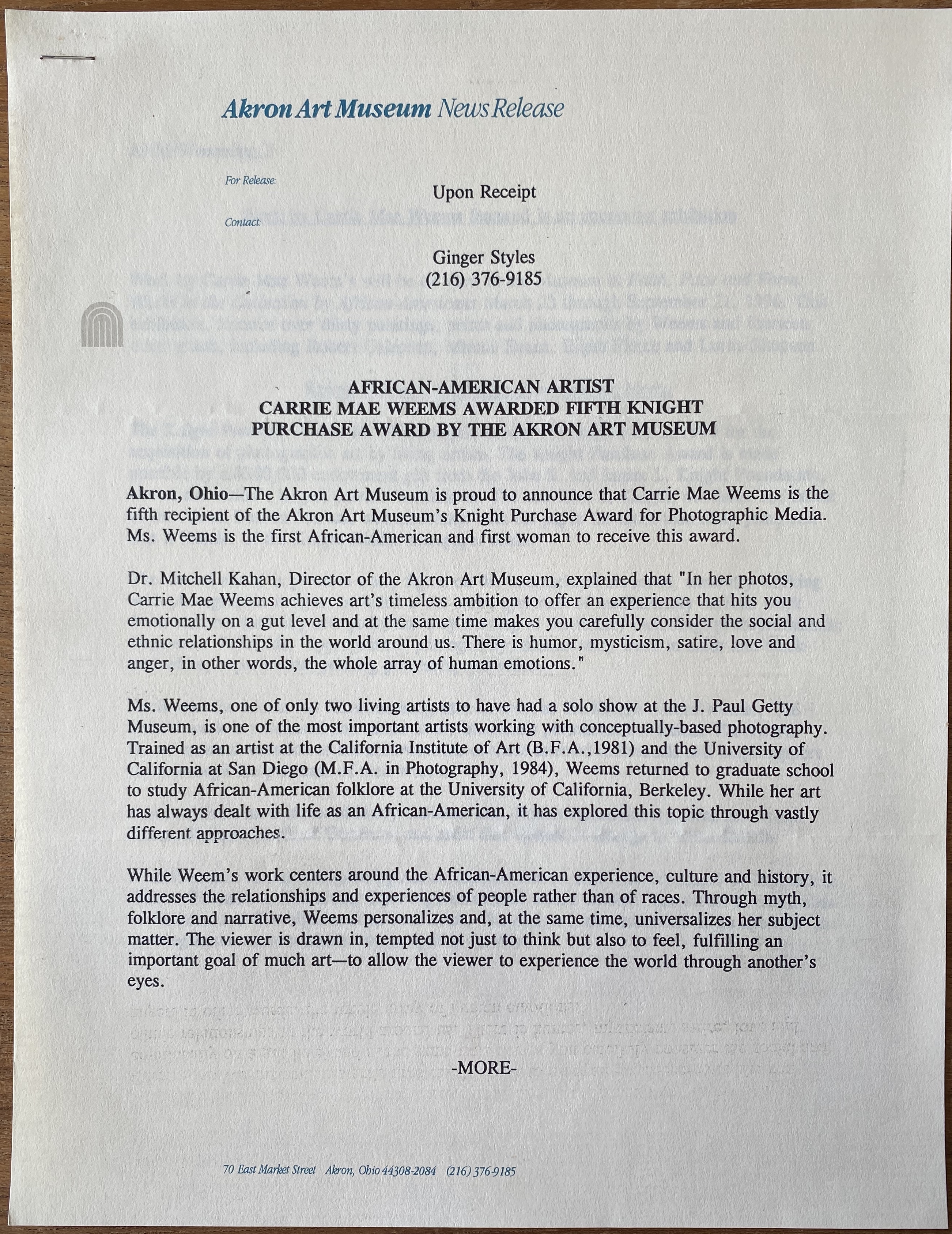 (Carrie Mae Weems). African-American Artist Carrie Mae Weems Awarded Fifth Knight Purchase Award by the Akron Art Museum
