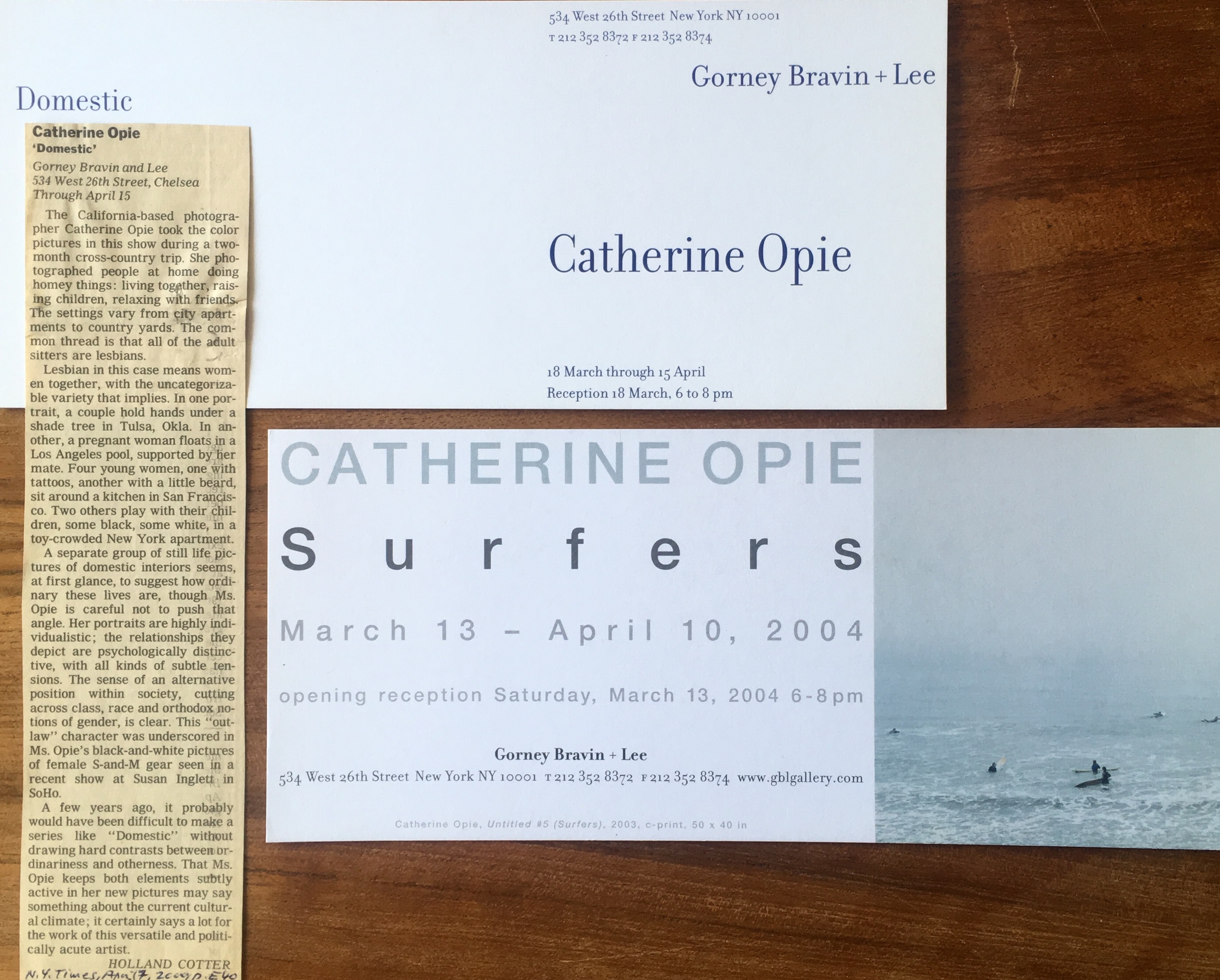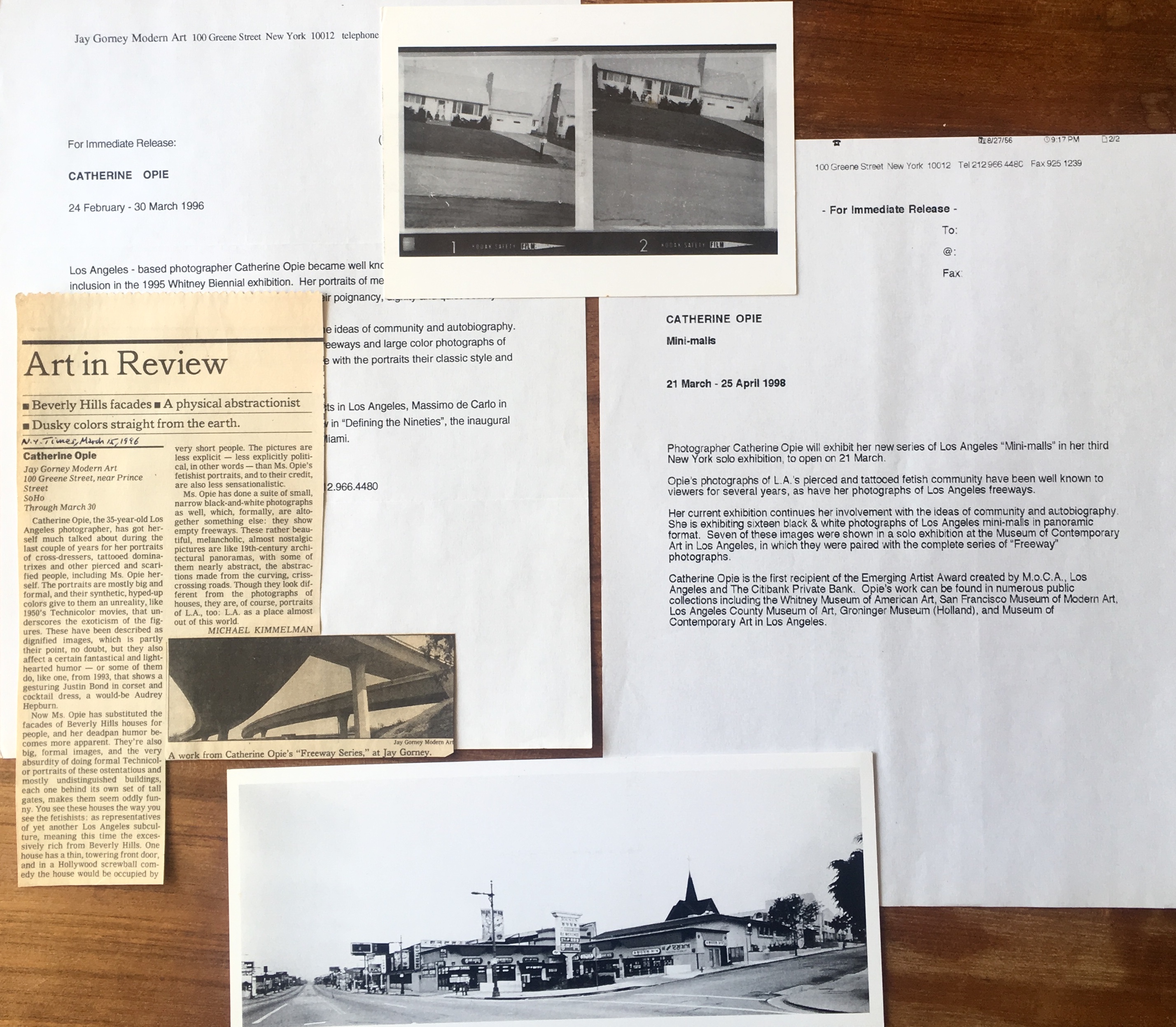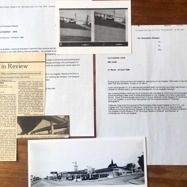 Catherine Opie. 2 illustrated exhibition announcement cards, 2 press release, Jay Gorney Modern Art, New York, with 1 review