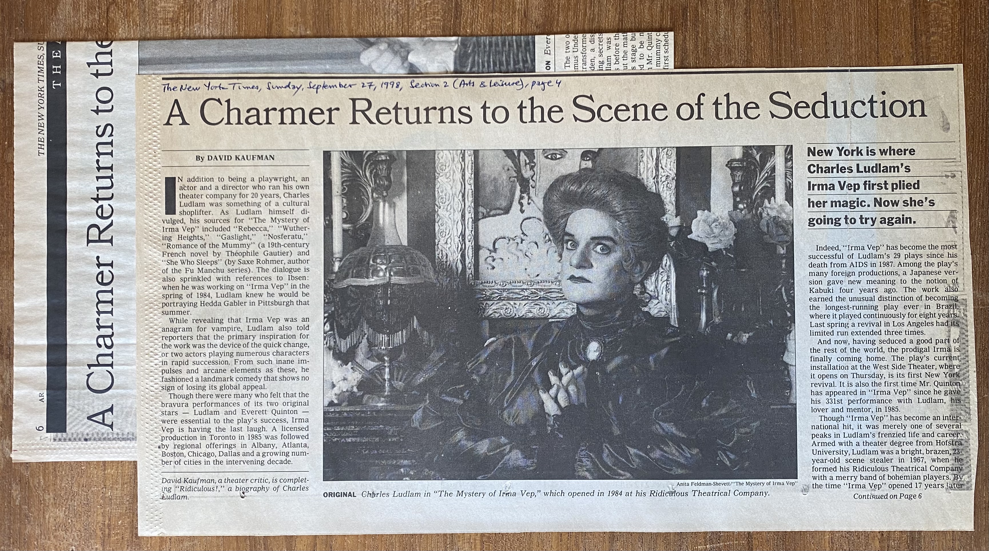 (Charles Ludlam/ The Mystery of Irma Vep). David Kaufman. A Charmer Returns to the Scene of the Seduction. The New York Times, September 27, 1998.