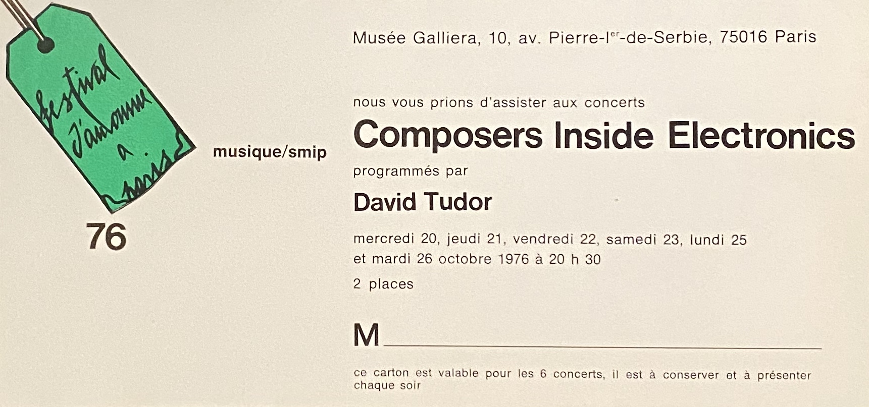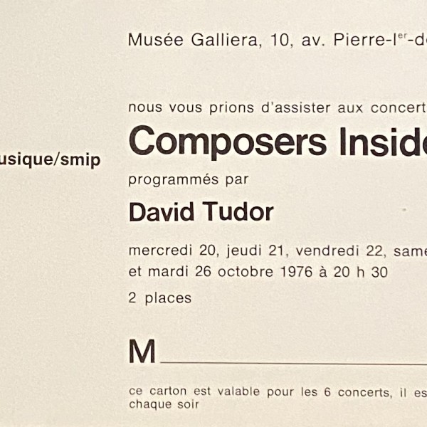 (Composers Inside Electronics). … concerts présentes par David Tudor. Musée Galliera, Paris, 20, 21, 22, 23, 25, 26, 1976