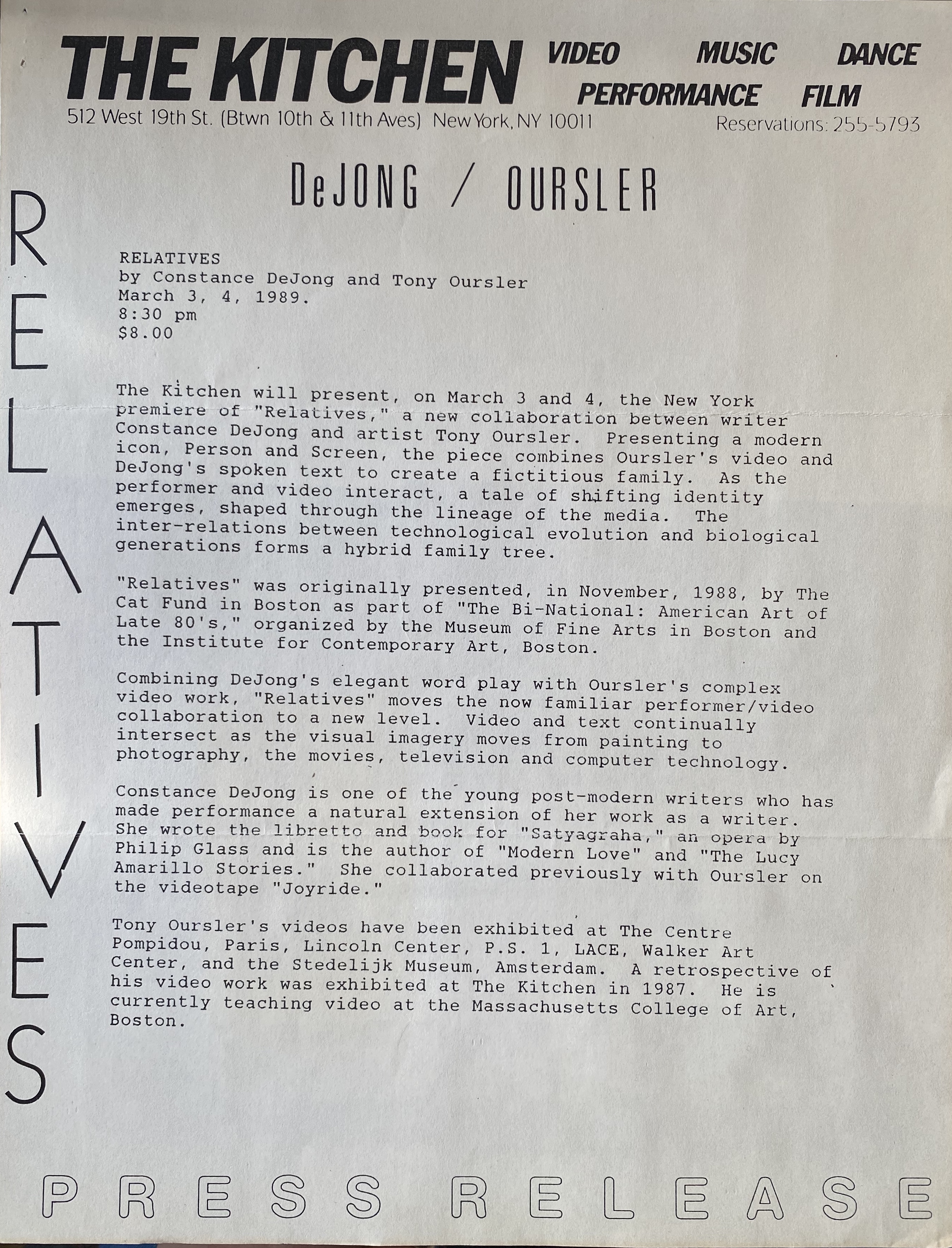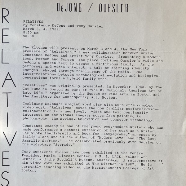 (Constance De Jong / Tony Oursler). De Jong / Oursler. Relatives. The Kitchen, New York, March 3, 4, 1989