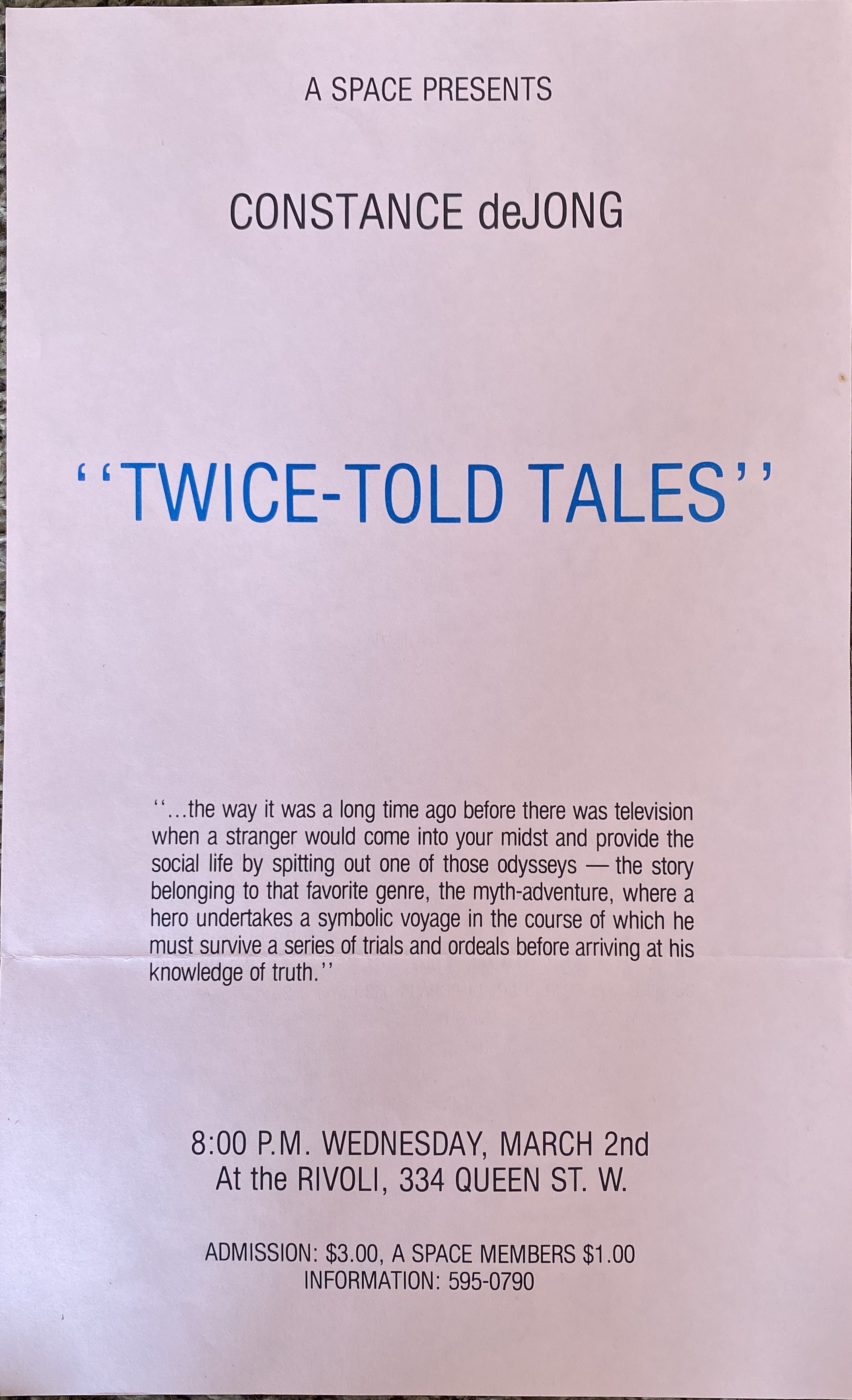 Constance De Jong. “Twice-Told Tales” A Space, [Toronto, Ontario], March 2, [1983]