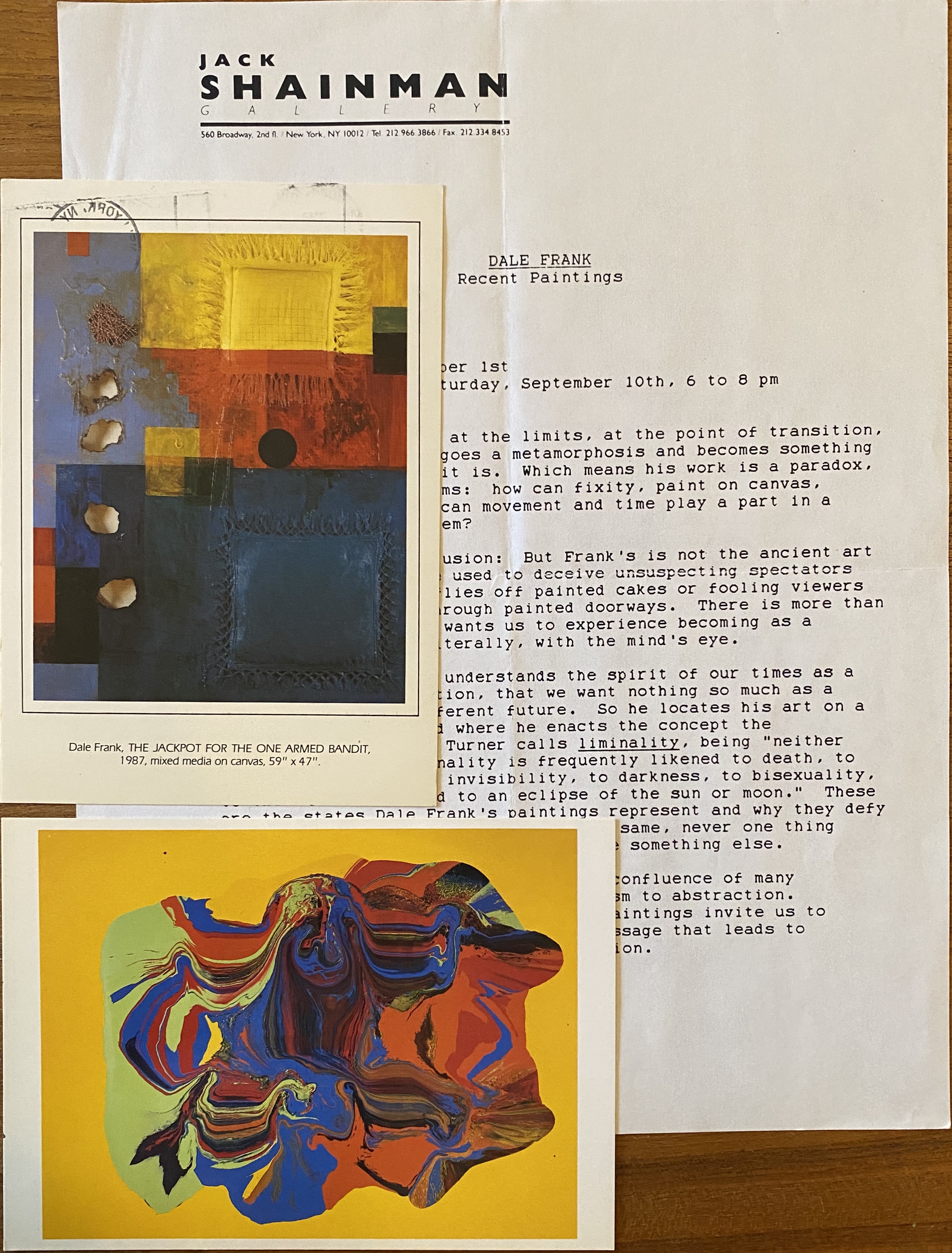 Dale Frank. 2 illustrated exhibition announcement cards, Jack Shainman Gallery, New York, 6 x 4 1/4″ / 15.2 x 10.8cm each, and 1 press release