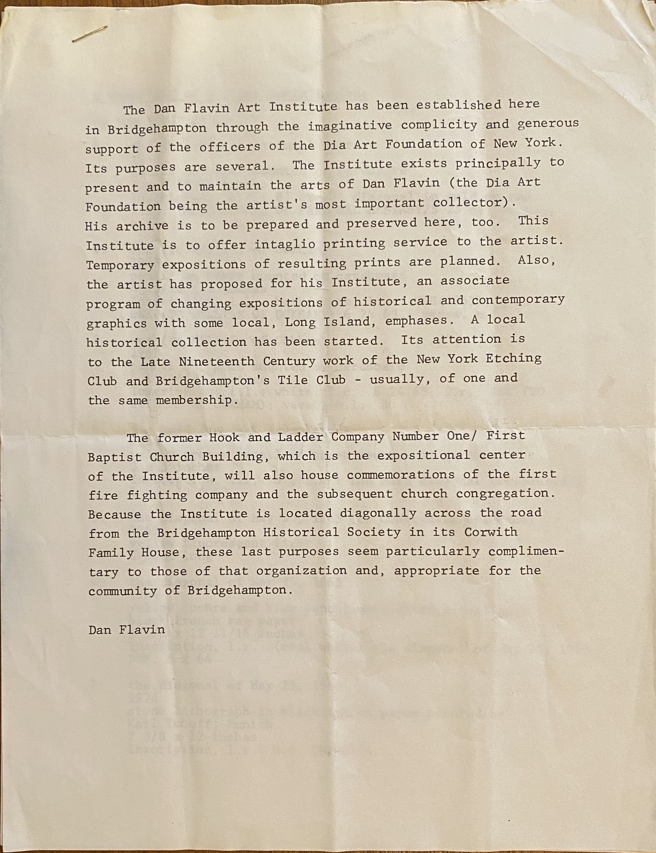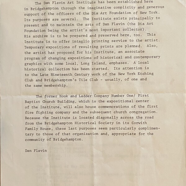 Dan Flavin. The Dan Flavin Institute has been established… No date [1983?]