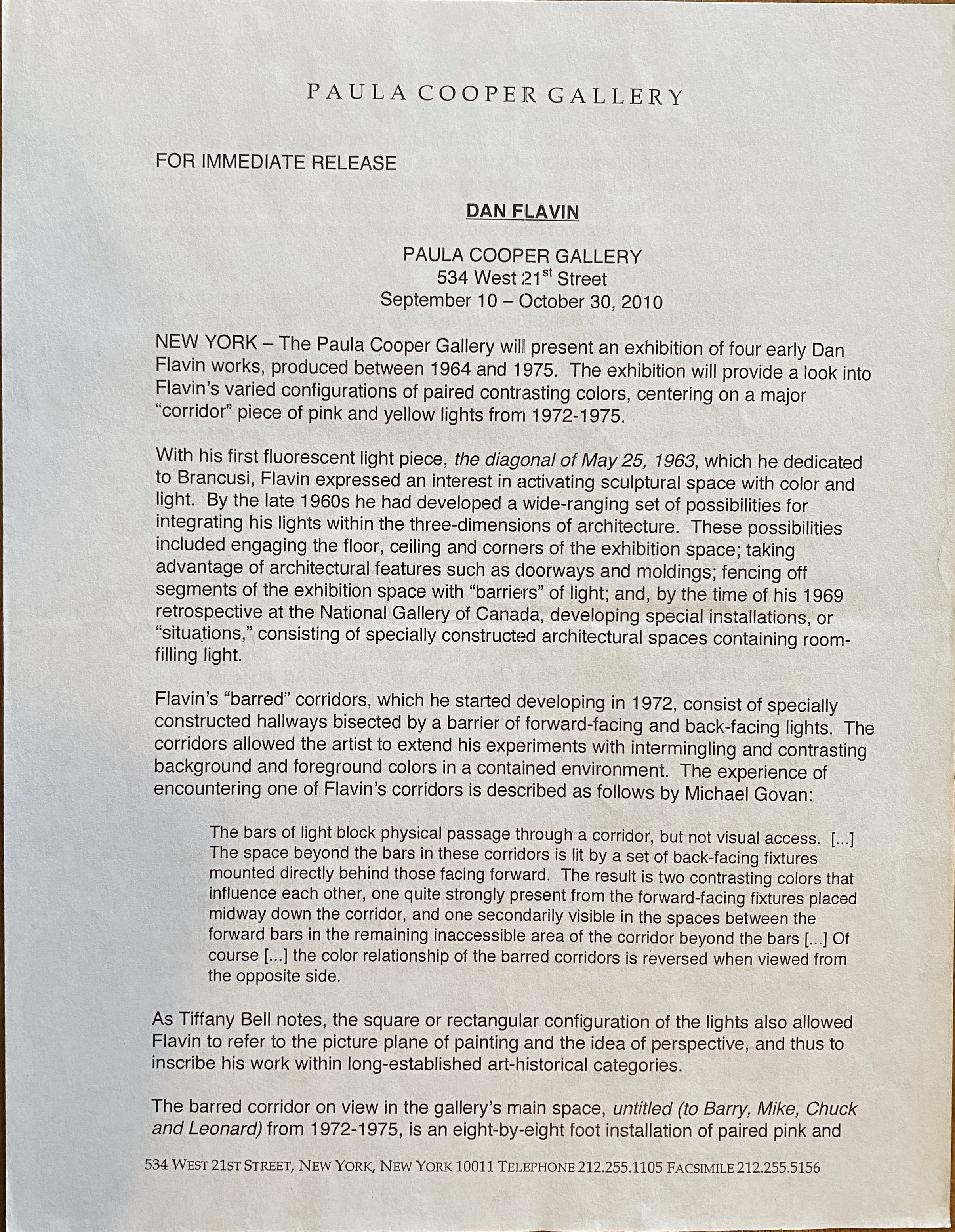 (Dan Flavin). Dan Flavin. Paula Cooper Gallery, New York, September 10 – October 30, 2010