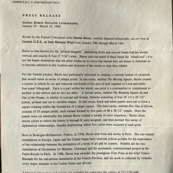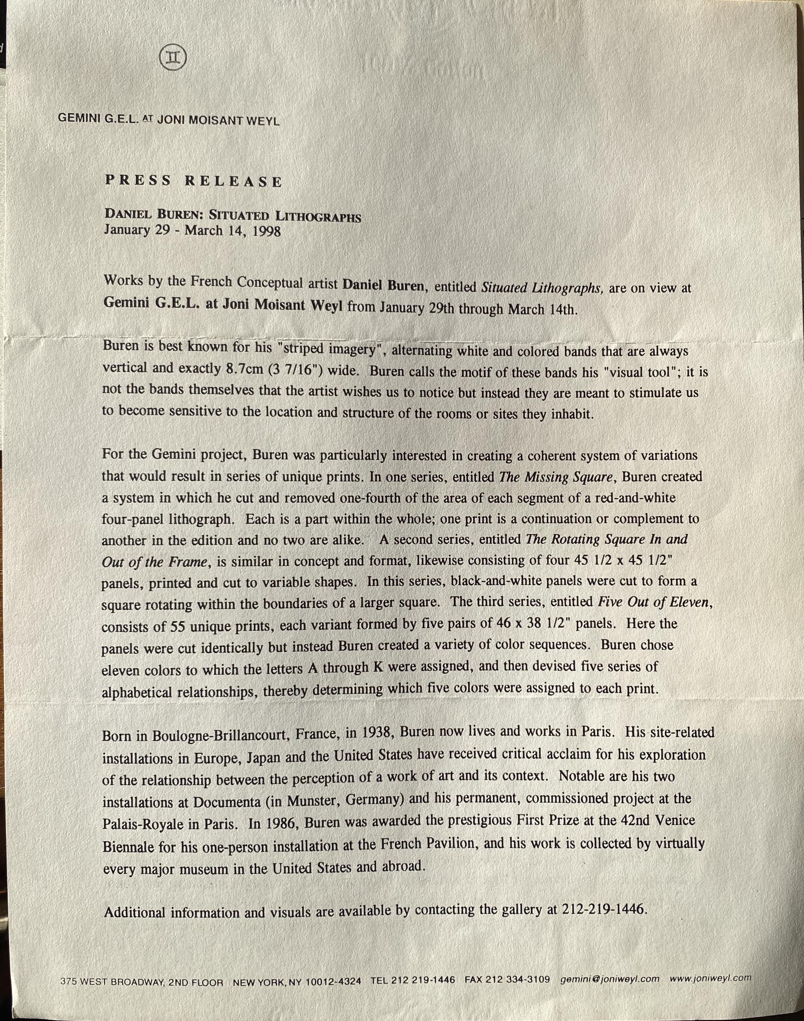 (Daniel Buren). Daniel Buren: Situated Lithographs. Gemini G.E.L. at Joni Moisant Weyl, New York, January 29 – March 14, 1998