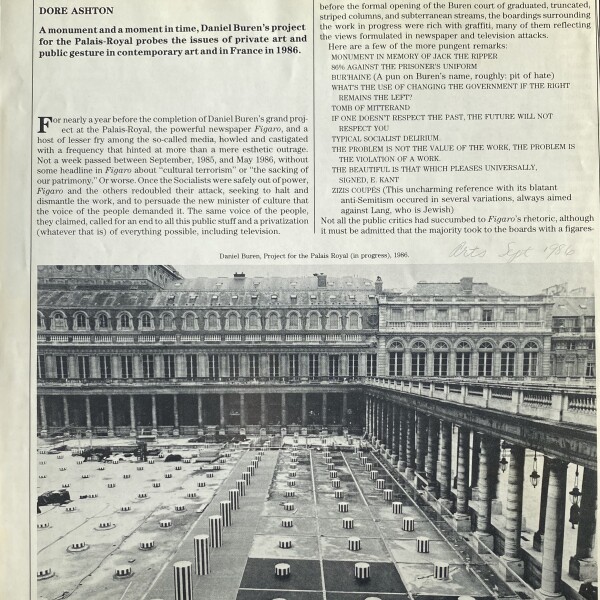 (Daniel Buren). Dore Ashton. Paris Publicized and Privatized: Daniel Buren et la Palais-Royal. Arts Magazine. Volume 61/#1, September 1986