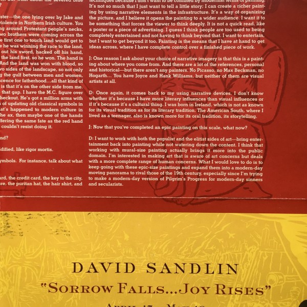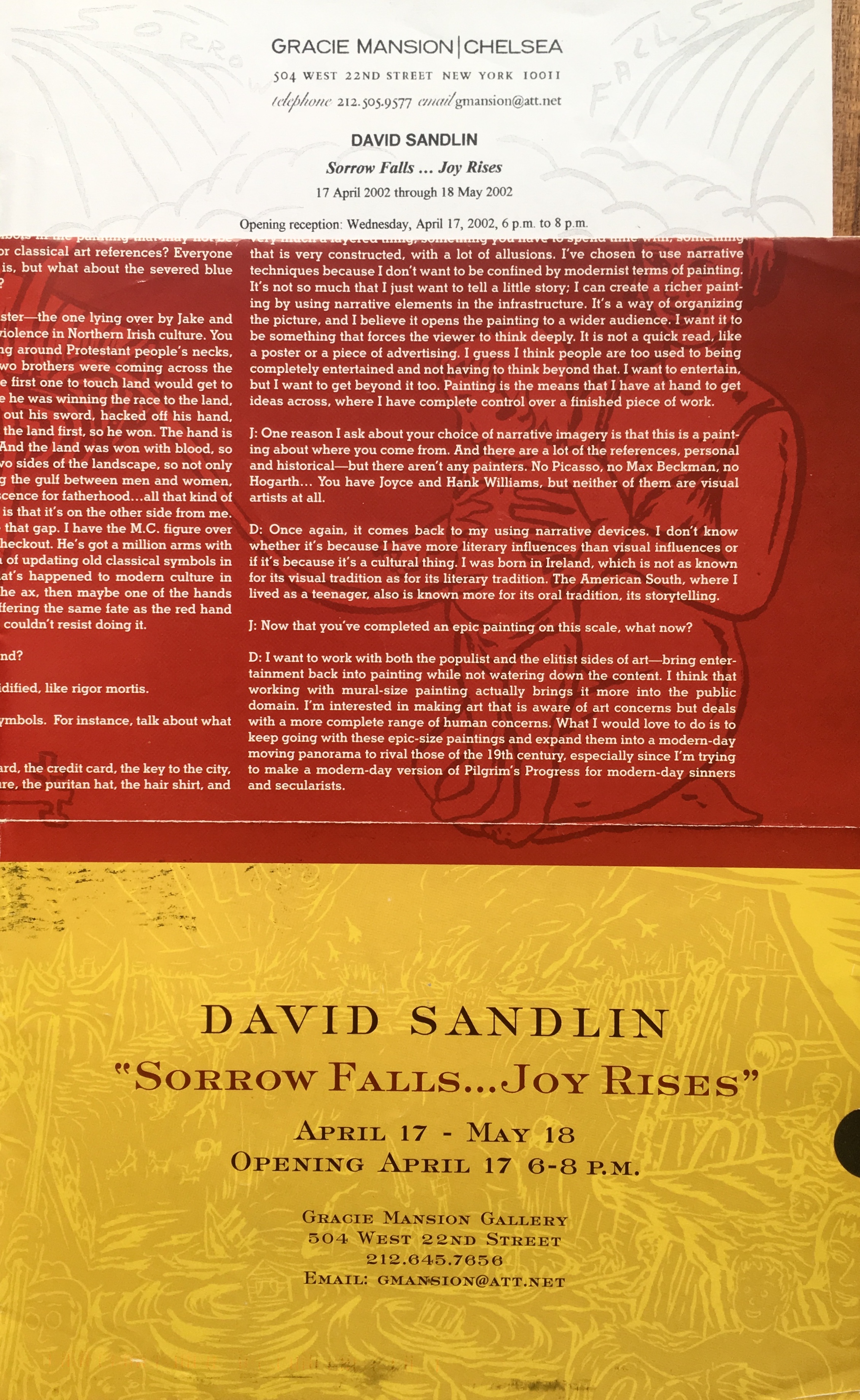 David Sandlin. “Sorrow Falls… Joy Rises.” Gracie Mansion / Chelsea, New York, April 17 – May 18, [2002]