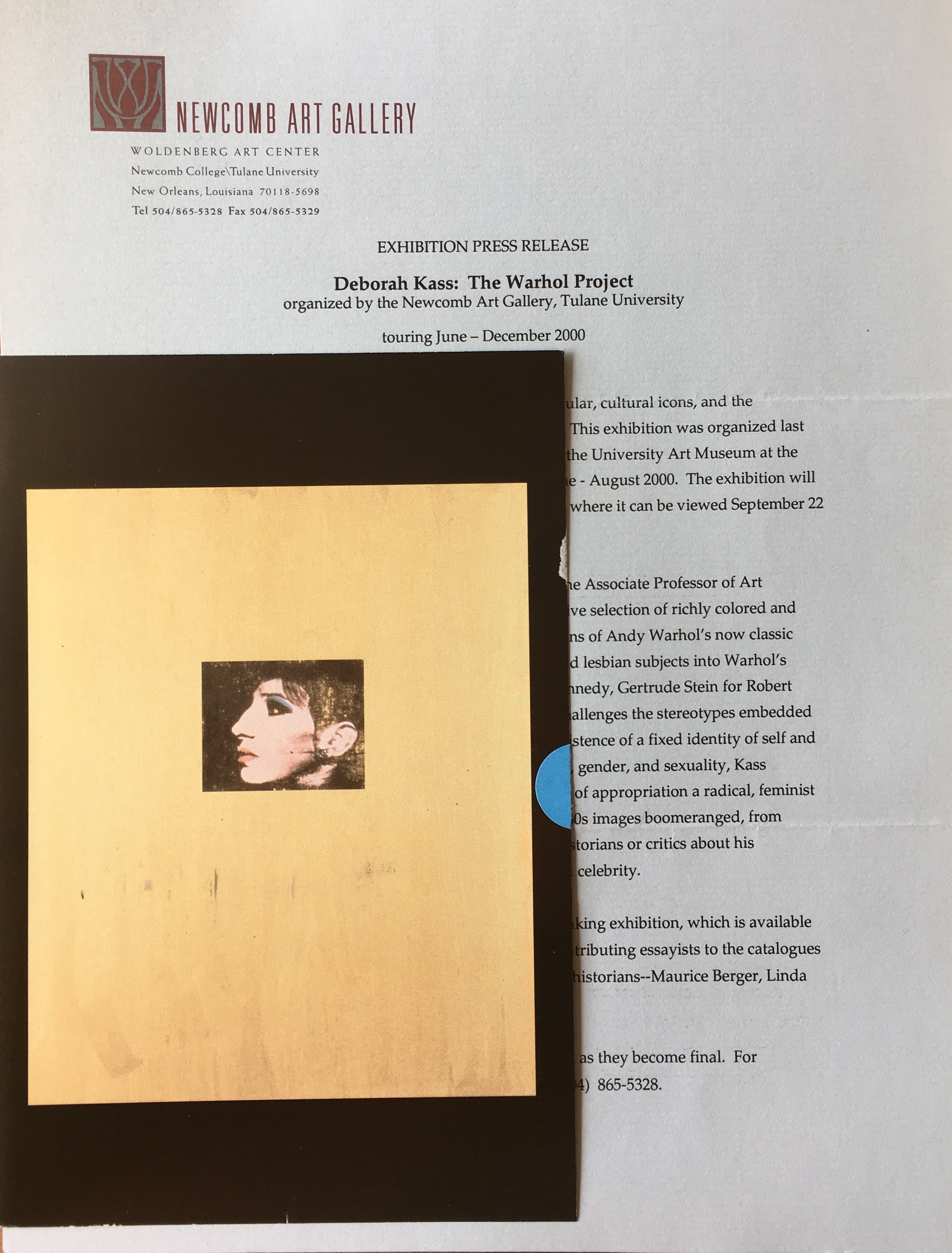 (Deborah Kass). Deborah Kass: The Warhol Project. Newcomb Art Gallery, Woldenberg Art Center, Newcomb College/Tulane University, New Orleans, Louisiana, March 8-29, 1999