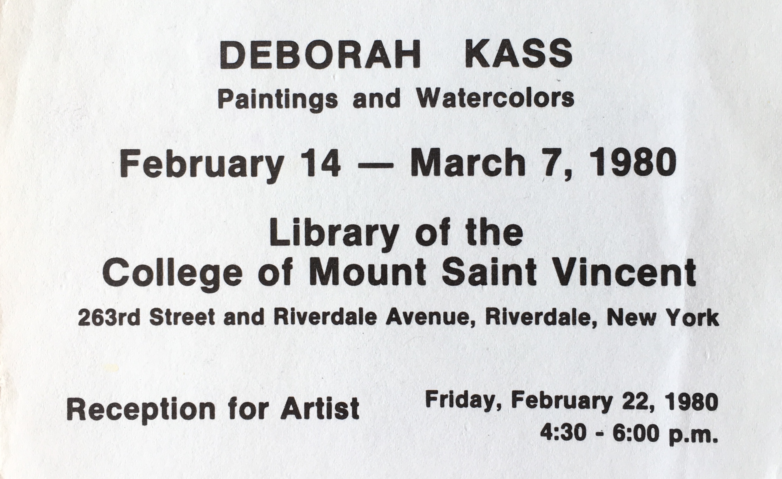 Deborah Kass. Paintings and Watercolors. Library of the College of Mount Saint Vincent, Riverdale, New York, February 14 – March 7, 1980