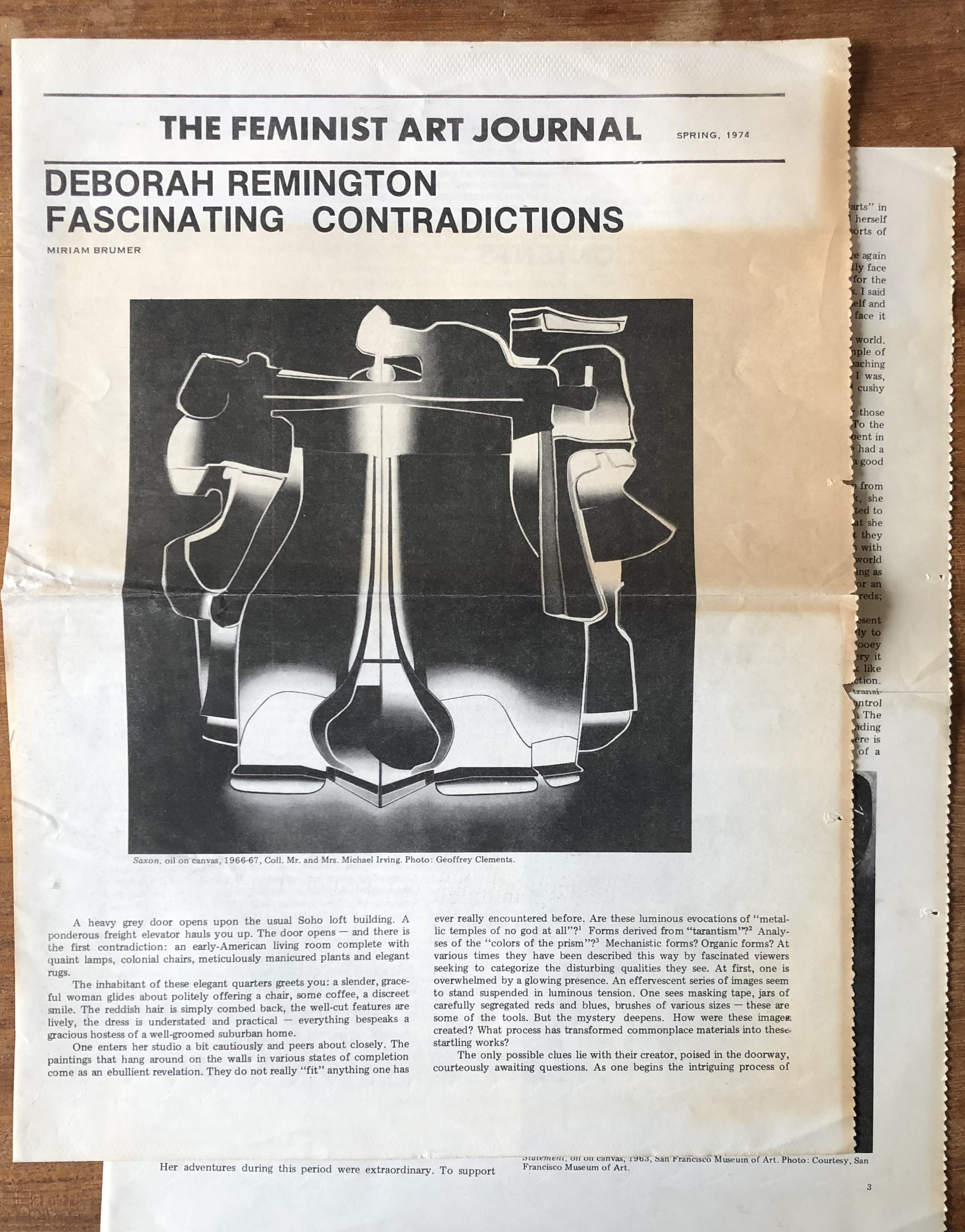 (Deborah Remington). Cindy Nemser. Deborah Remington: Fascinating Contradictions. The Feminist Art Journal. Volume 3/#1, Spring 1974. 3 pages (i.e. pages 2 – 4). 4 illustrations.