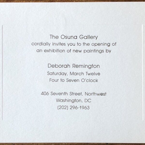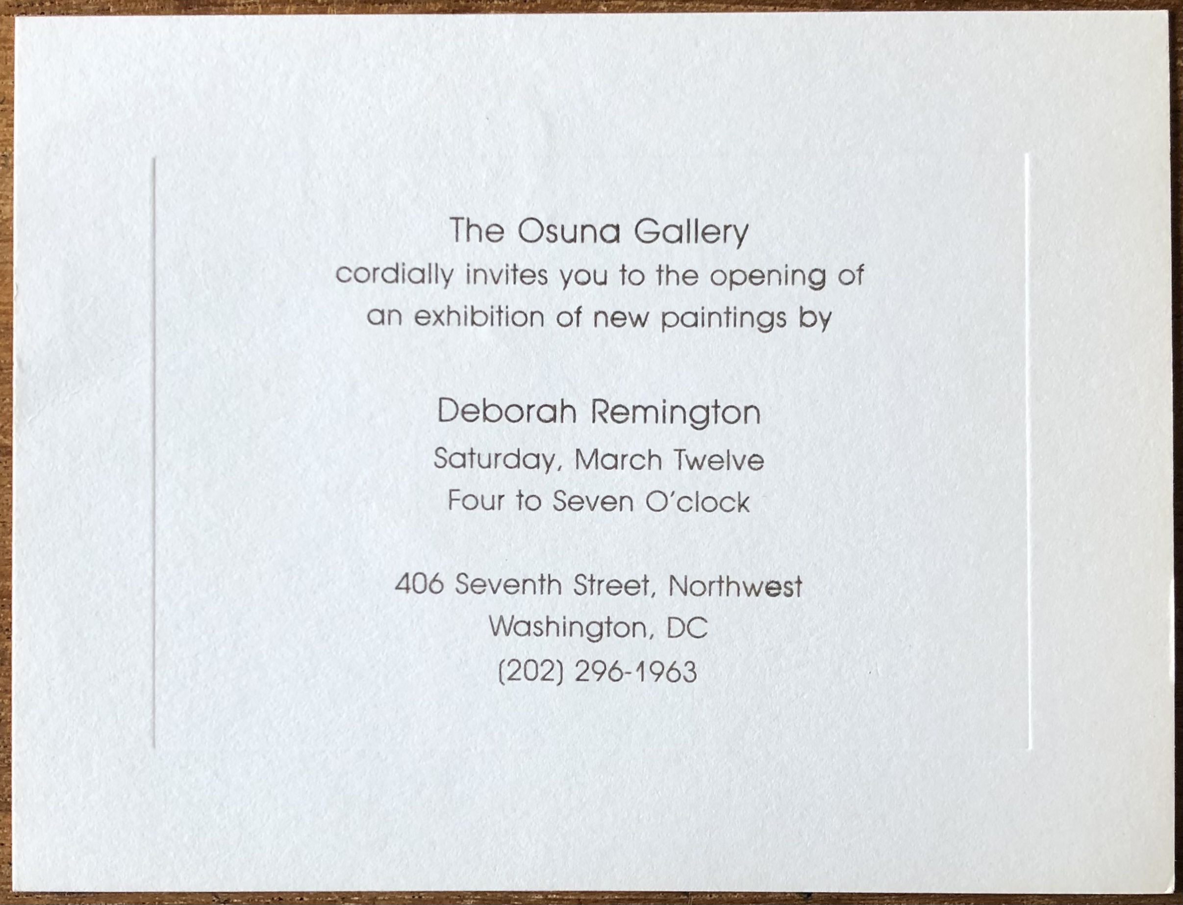 (Deborah Remington). New paintings by Deborah Remington. Osuna Gallery, Washington, D.C., March 12, [1983]