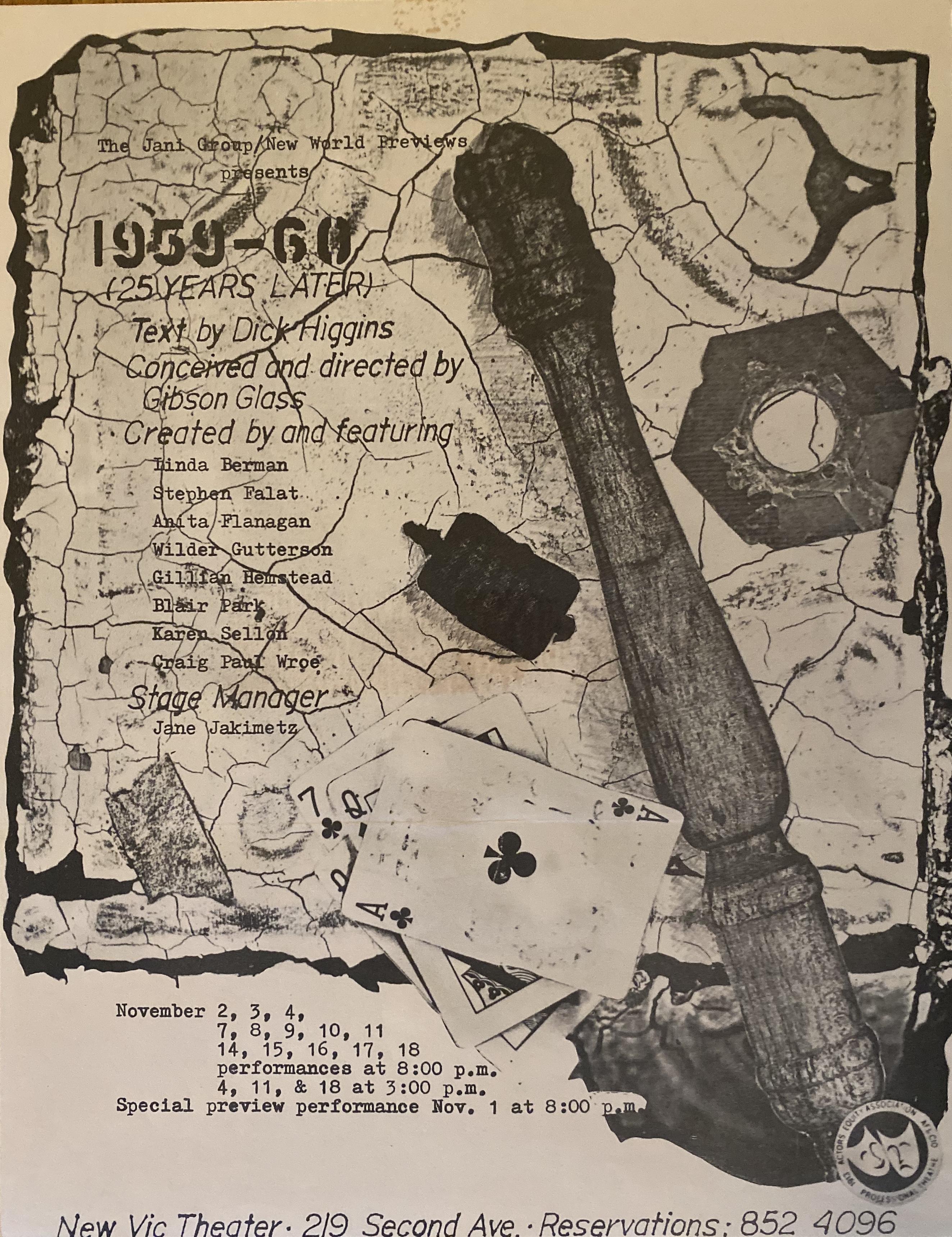(Dick Higgins). 1959-60 (25 Years Later). Text by Dick Higgins. New Vic Theatre, November 2, 3, 4, 7, 8, 9, 10, 11, 14, 15, 16, 17, 18, Special [1984]. Special preview November 1