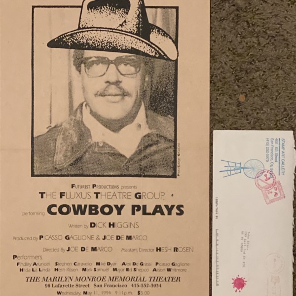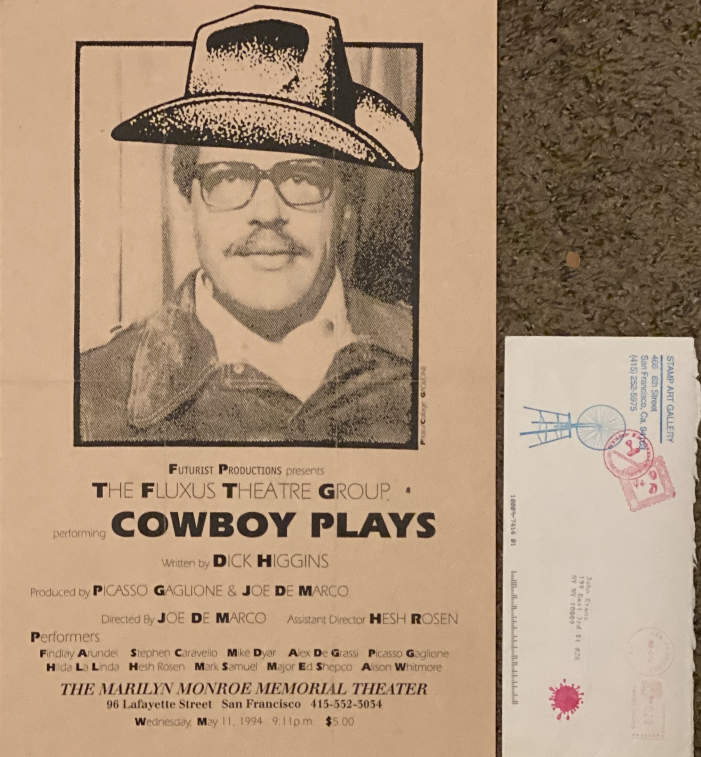 (Dick Higgins). Fluxus Productions presents The Fluxus Thatrw Group performing Cowboy Plays written by Dick Higgins. The Marilyn Monroe Memorial Theatre, San Francisco, May 11, 1995