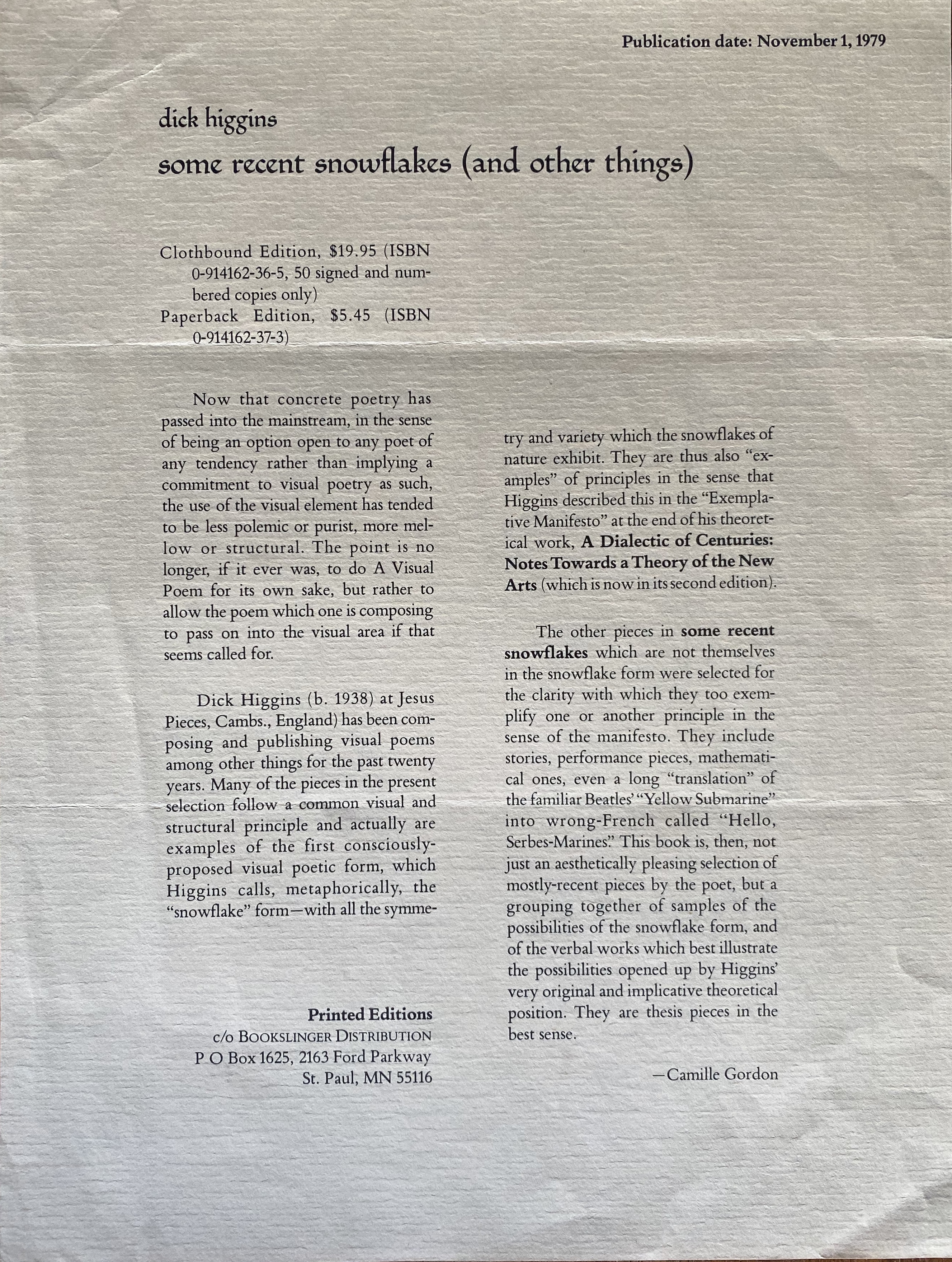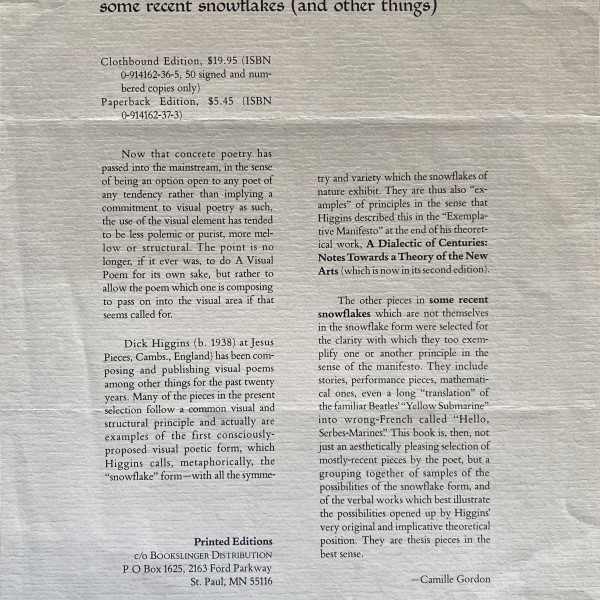 Dick Higgins. Some recent snowflakes (and other things). New York: Printed Editions, 1979