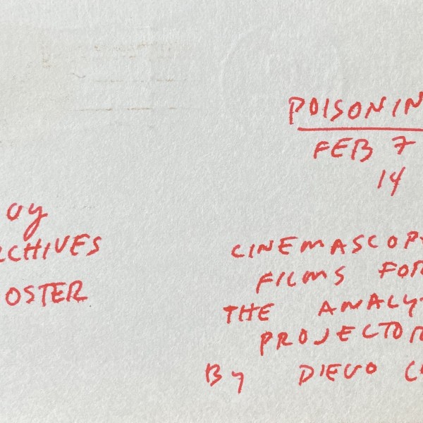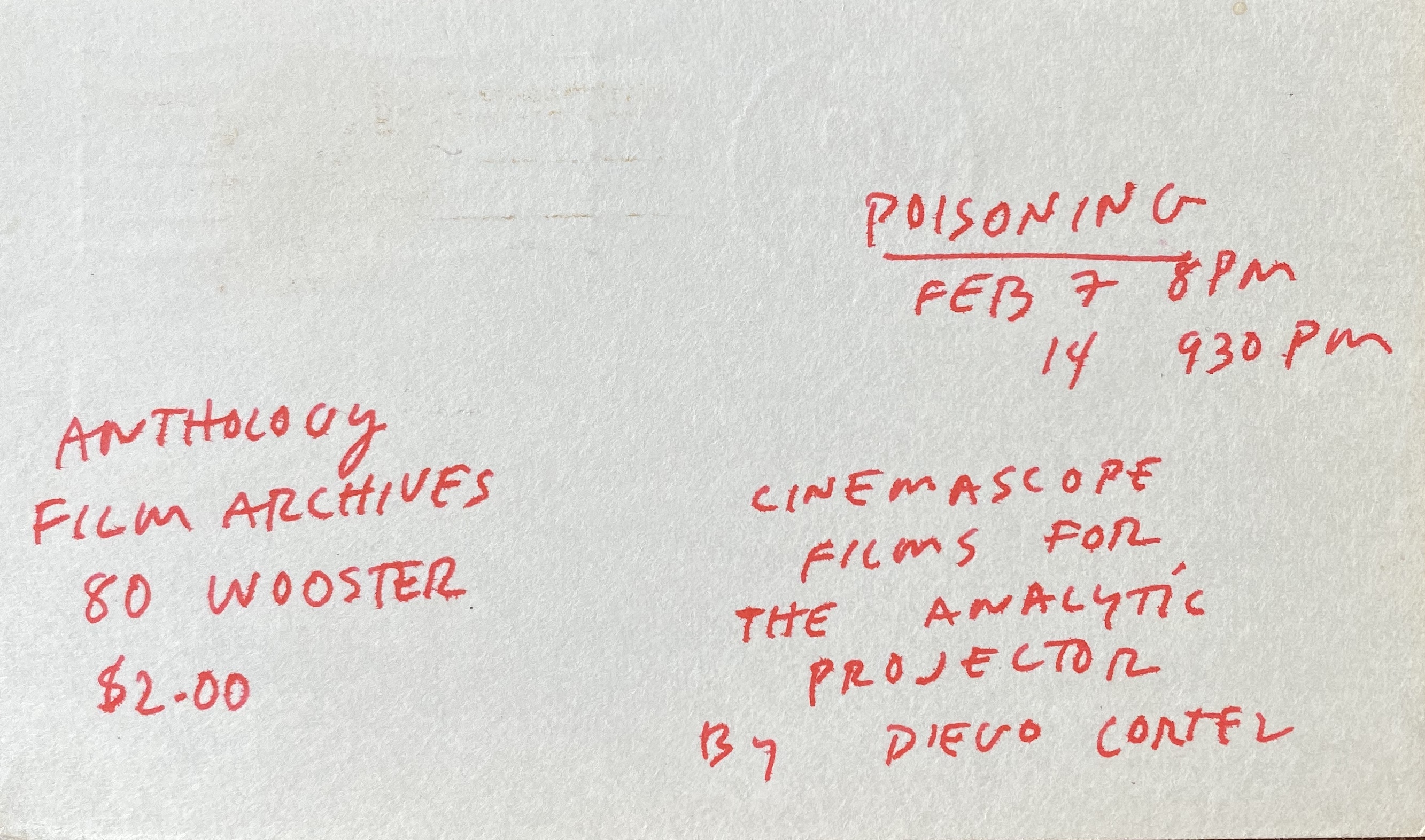 Diego Cortez (James Curtis known as). Poisoning. Cinemascope films for the analytic projector, by Diego Cortez. Anthology Film Archives, [New York], February 7, 14, [1976]
