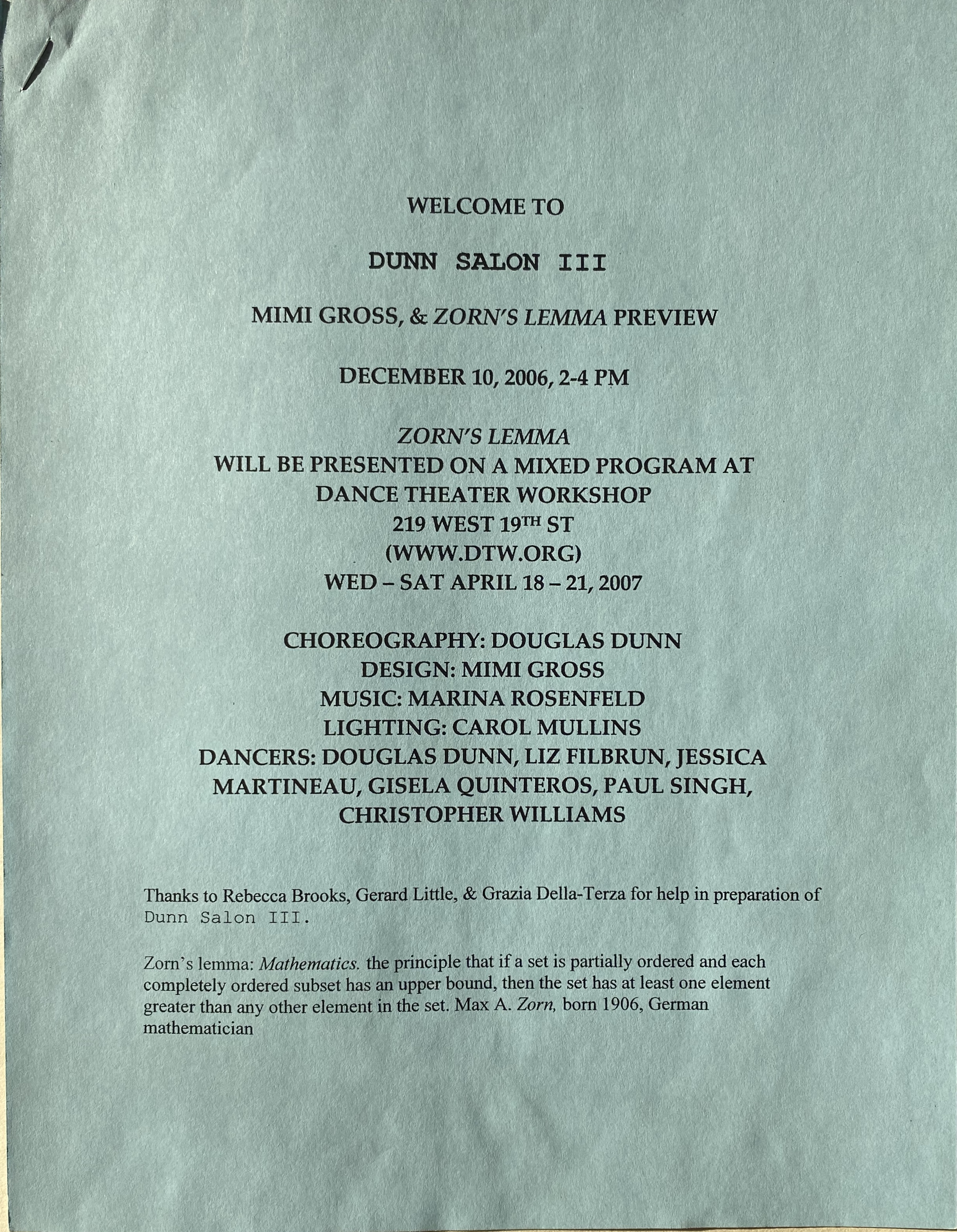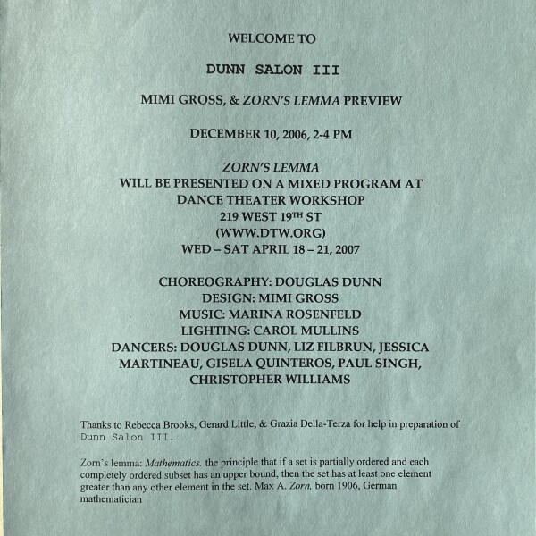 (Douglas Dunn). Dunn Salon III / Mimi Gross & Zorn’s Lemma Preview. Dance Theater Workshop, [New York], April 18-21, 2007