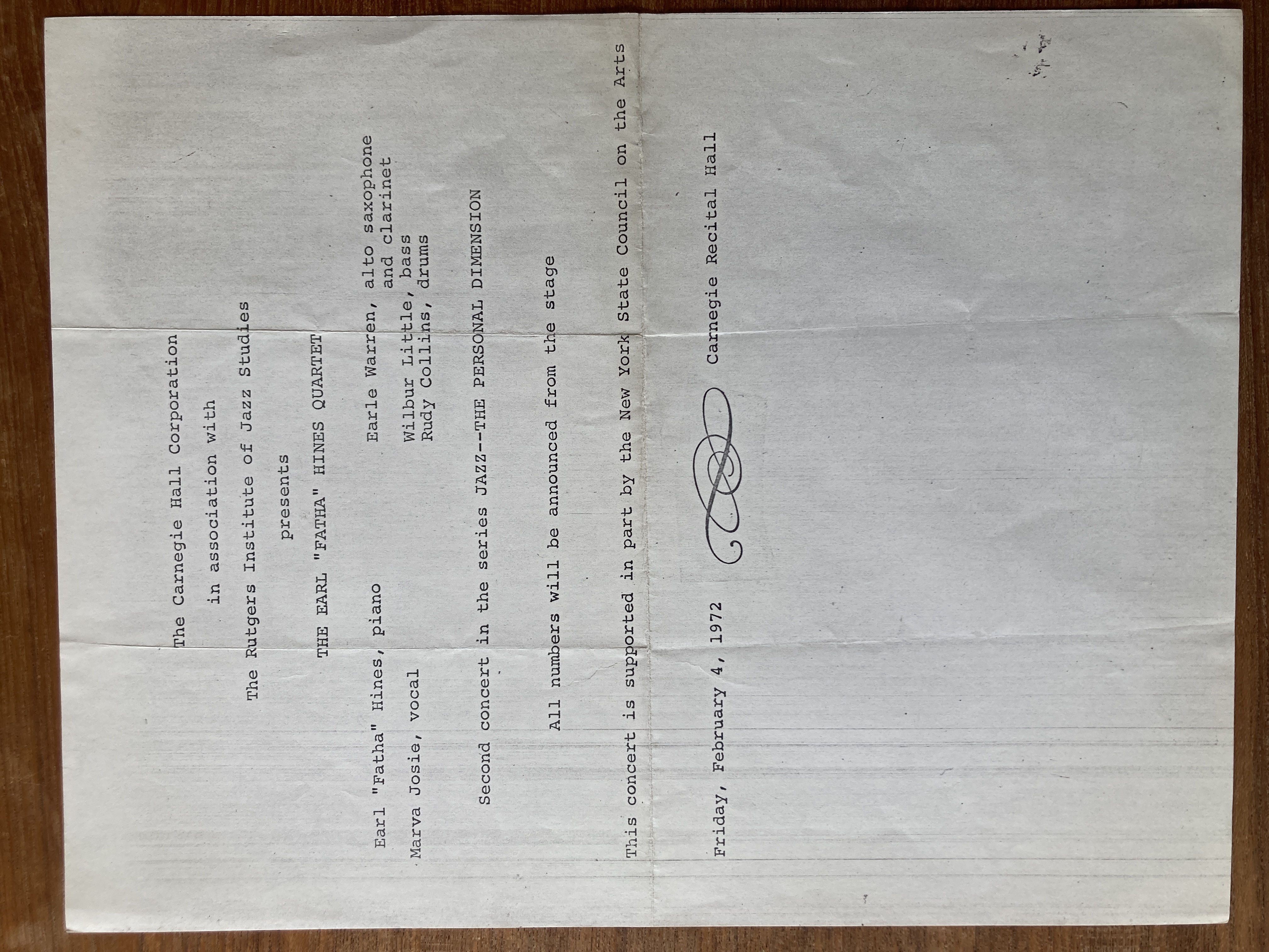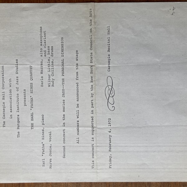 (Earl Hines). The Earl “Father” Hines Quartet. Carnegie Recital Hall. February 4, 1972