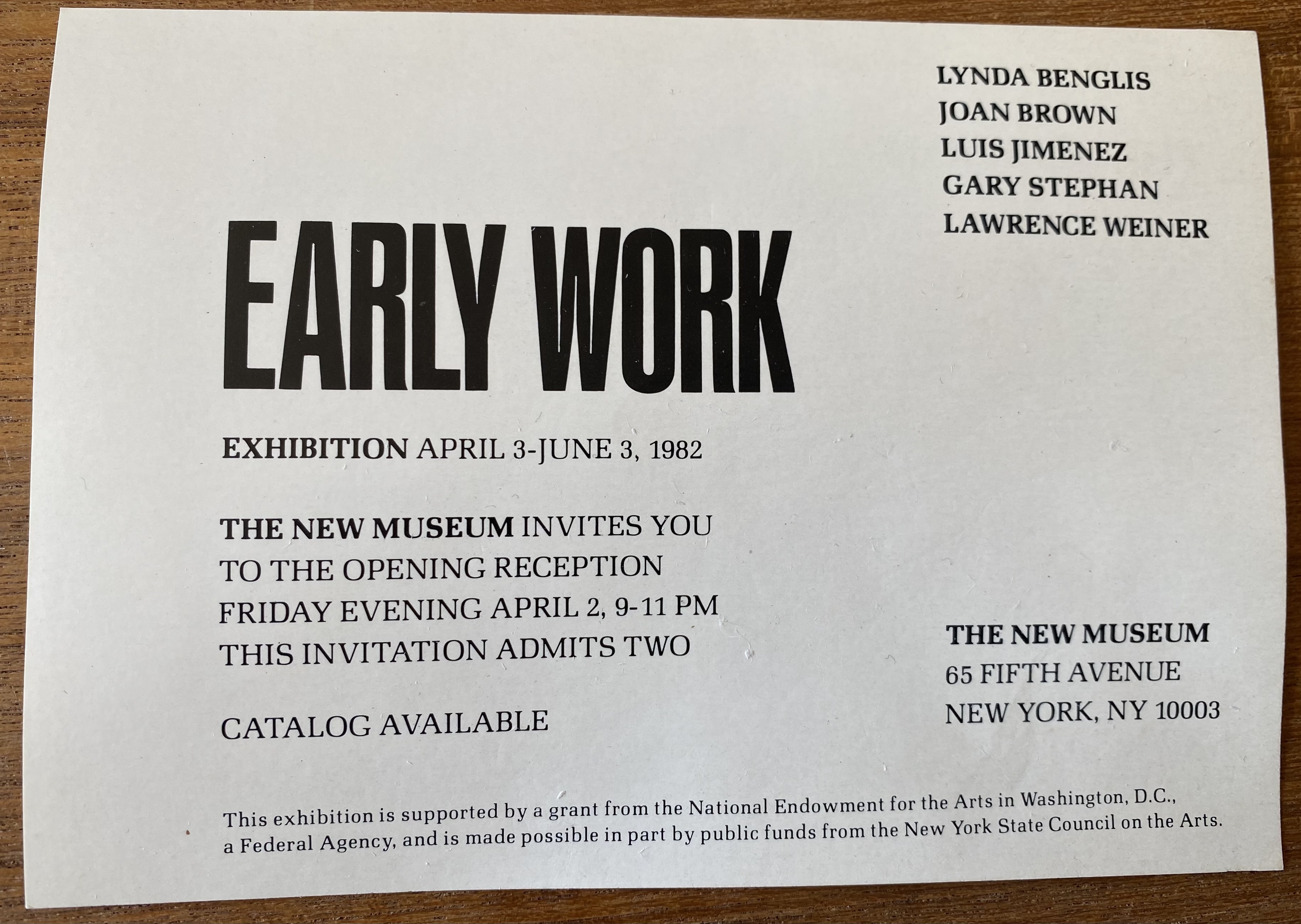 Early Work. Lynda Benglis, Joan Brown, Luis Jimenez, Gary Stephan, Lawrence Weiner. The New Museum, New York, April 3 – June 3, 1982.