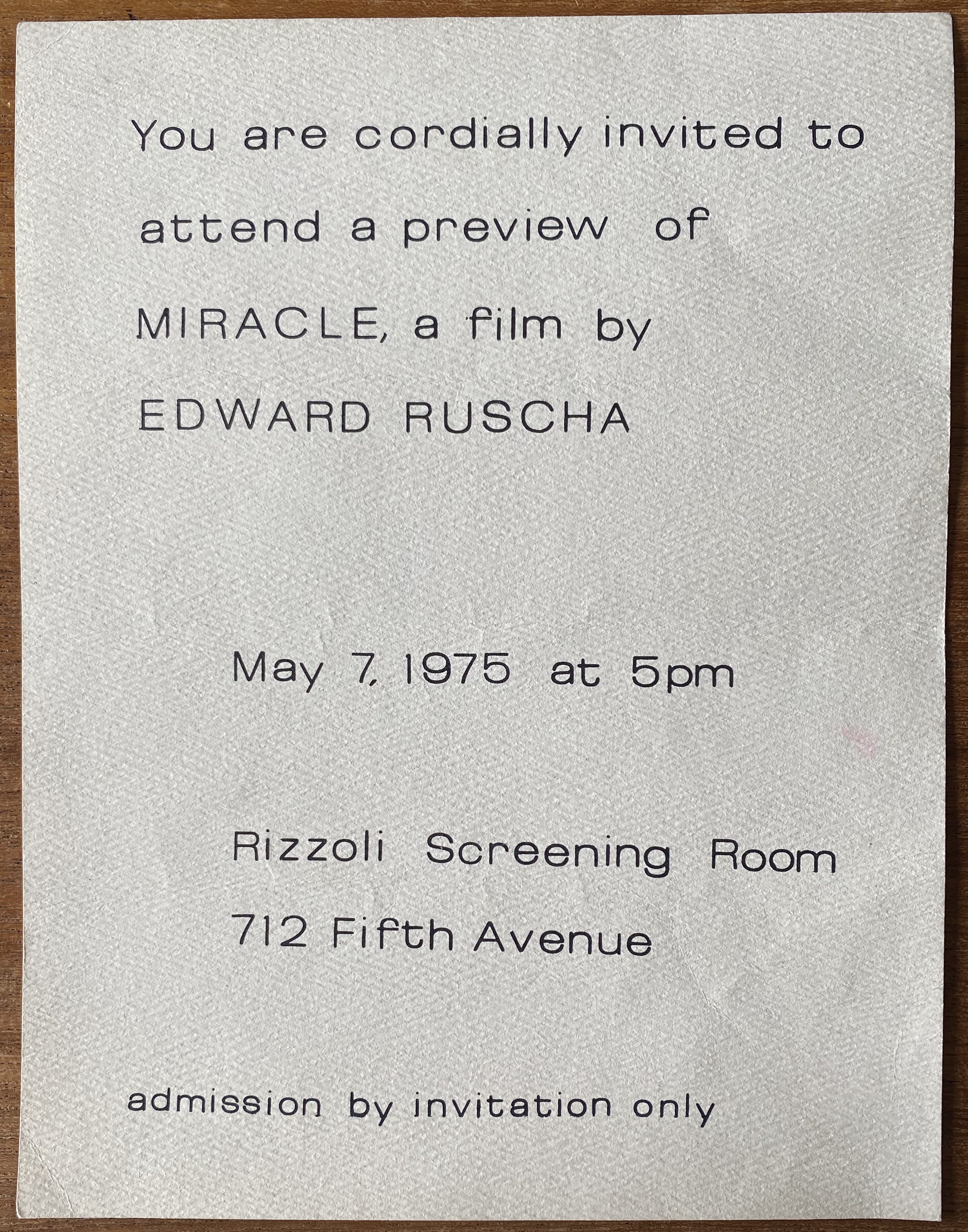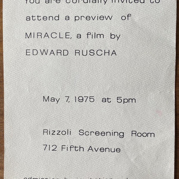 (Edward Ruscha). You are cordially invited to attend a preview of Miracle, a film by Edward Ruscha. Rizzoli Screening Room, 712 Fifth Avenue, [New York], May 7, 1975