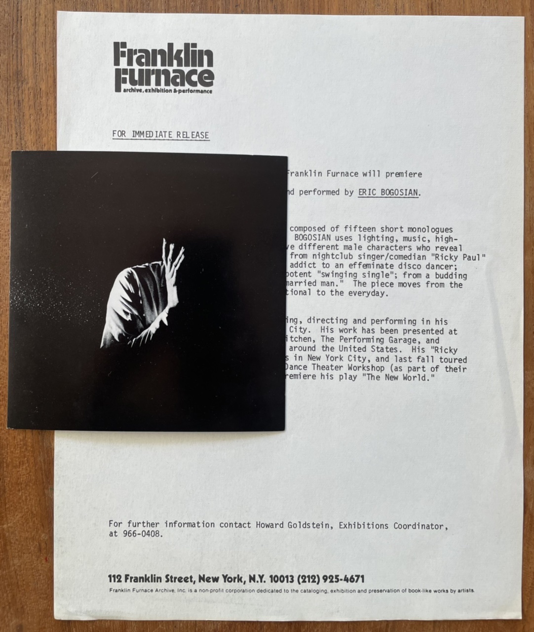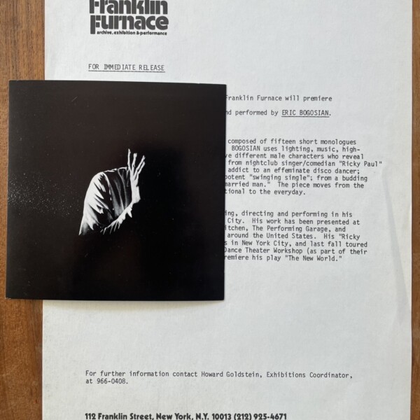(Eric Bogosian). Men Inside. A solo performance by Eric Bogosian. Franklin Furnace, New York, February 5, 1980